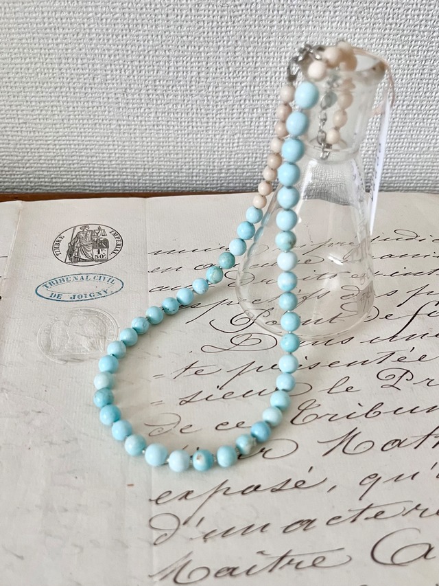 種子ほどの小さなシードビーズを入れた糸を手編みした、繊細なデザインのフランス グラスネックレス。 ヴィンテージガラスの鈍い輝きとソーダ水のような気泡が、装いに個性をプラスします。 繊細な作りにこだわった一点物のアクセサリーです。 マグネット金具を使用しているので、装着も簡単で快適です。 日常使いはもちろん、パーティーや特別なイベントにもおすすめ。時が奏でるガラスの魅力で、あなたをより一層引き立てます。 このエレガントなネックレスが、あなたの装いに上品さと個性をプラスします。 ※湿気や衝撃には注意して扱ってください。 素材 ガラスビーズ コットン糸 真鍮 長さ 約60cm 留め具はマグネットです