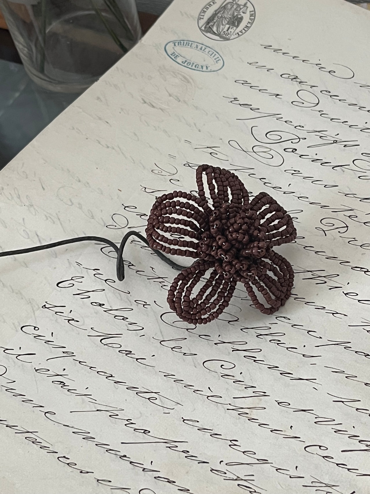 このショコラ ビーズフラワーは、ミルクチョコレート色のビーズを贅沢に使用し、クラシカルな美しいお花の形が特徴的なアイテムです。
