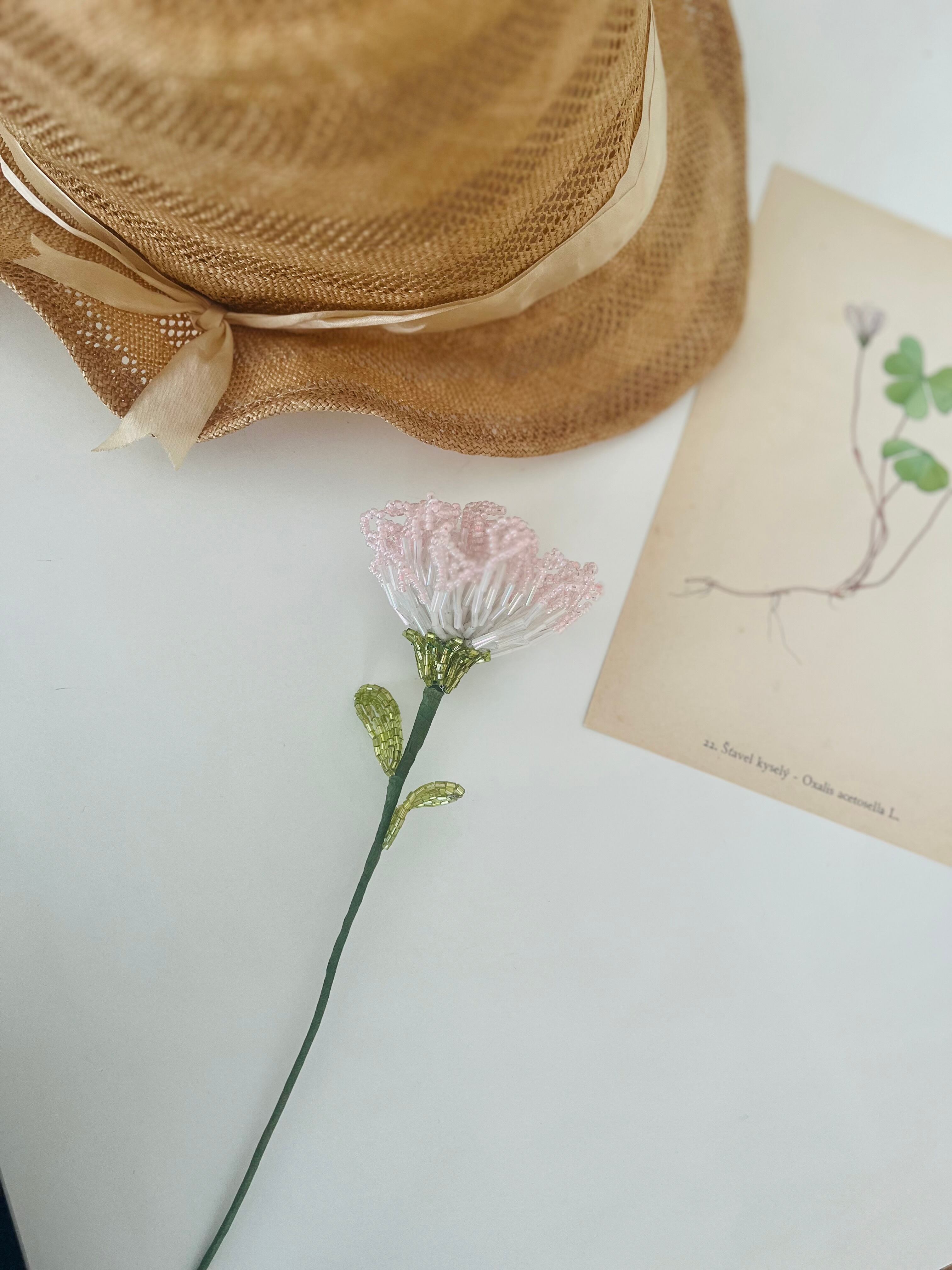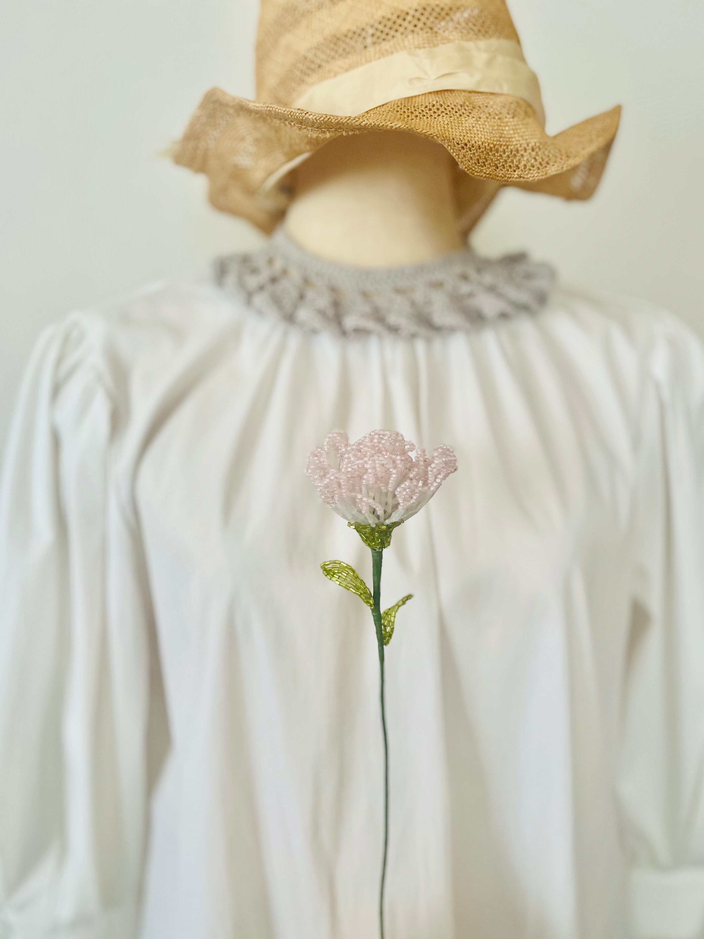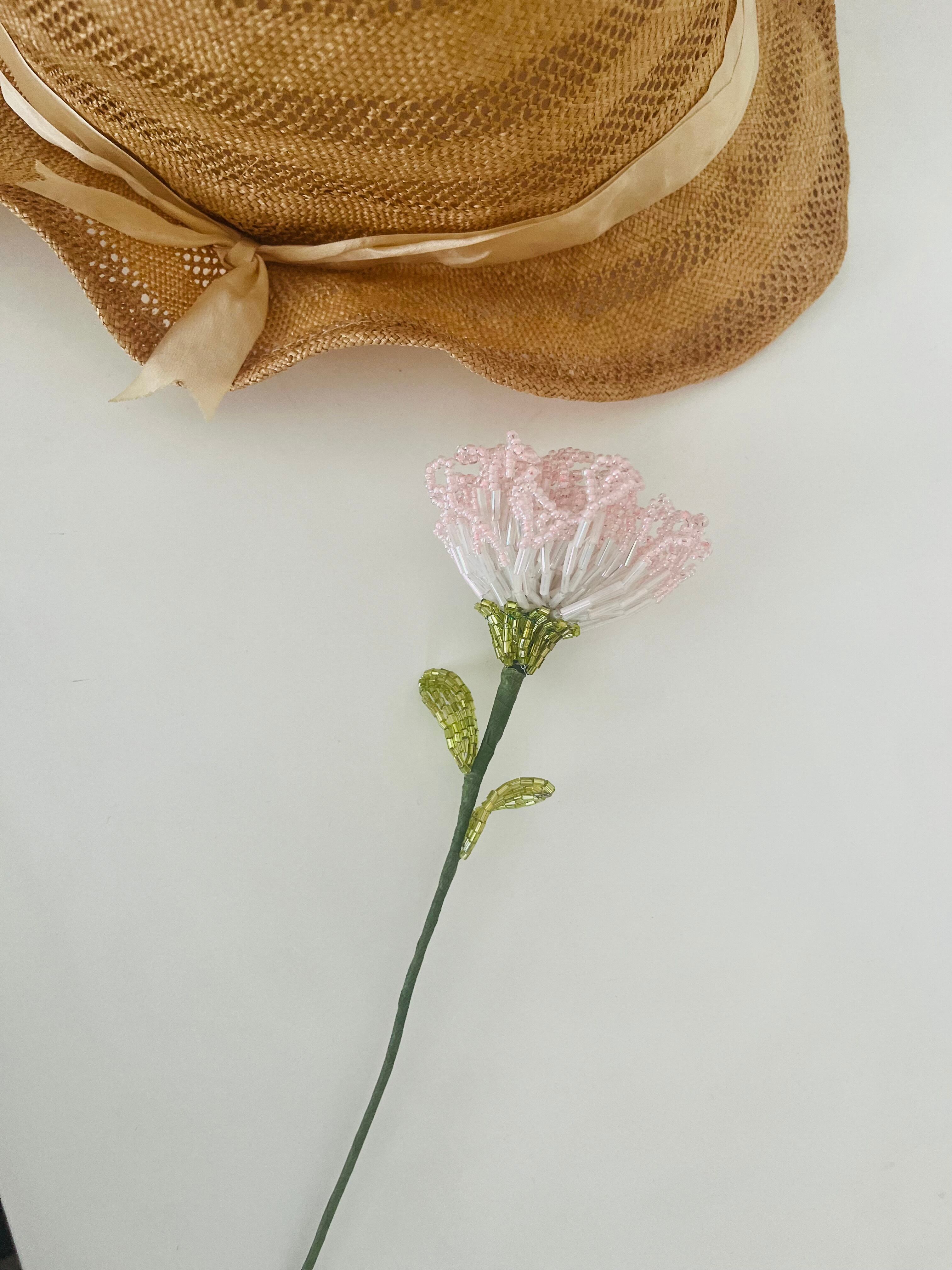 このカーネーション ビーズフラワーは、優しい色合いのビーズが使用されており、見る人を穏やかな気持ちにさせる特徴があります。