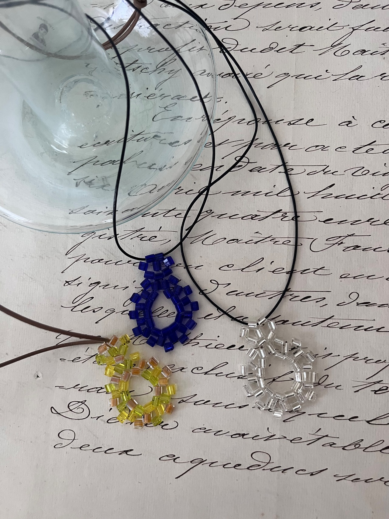 この革紐ペンダントは、個性的なキューブビーズが巧妙に絡み合い、他にない魅力を放つアクセサリーです。