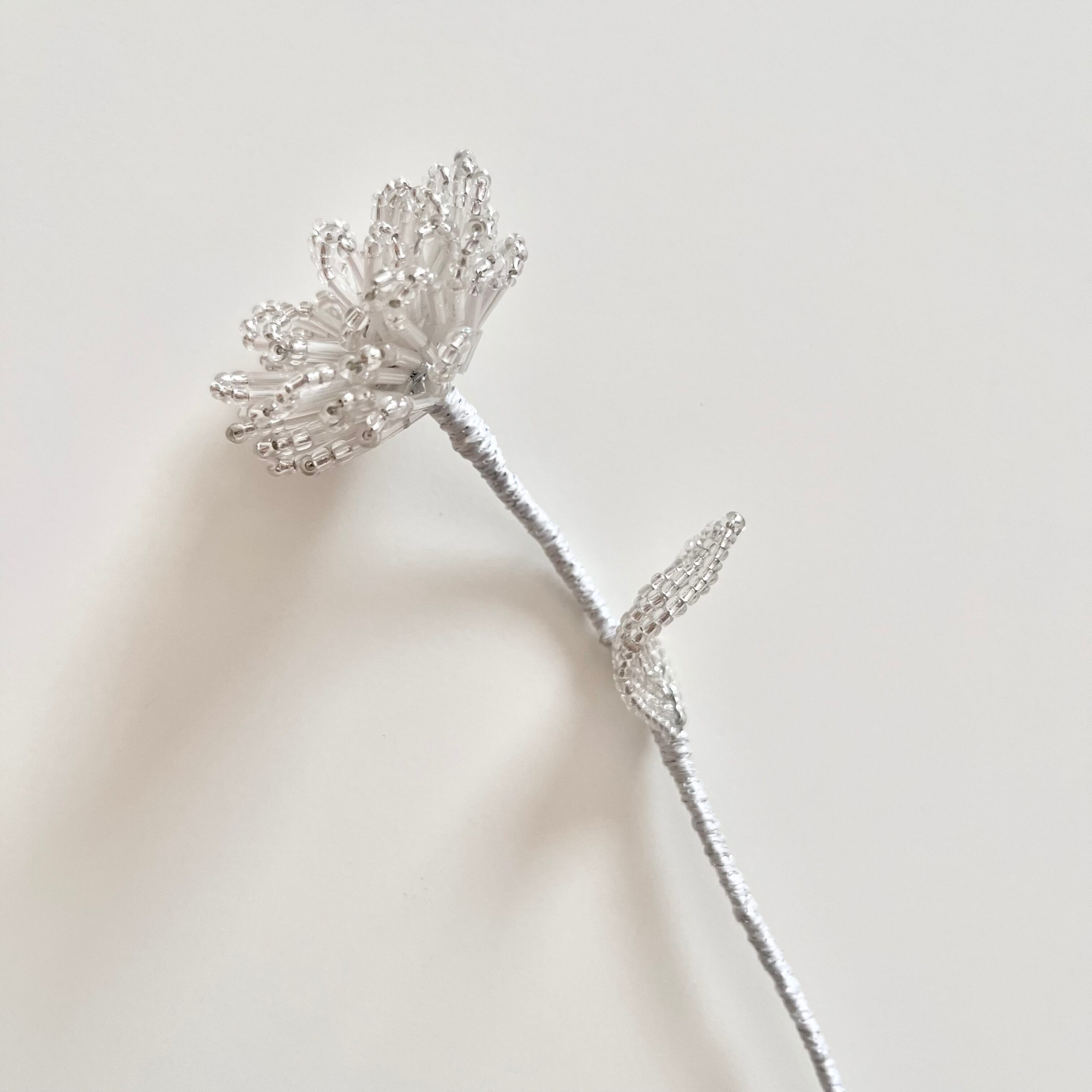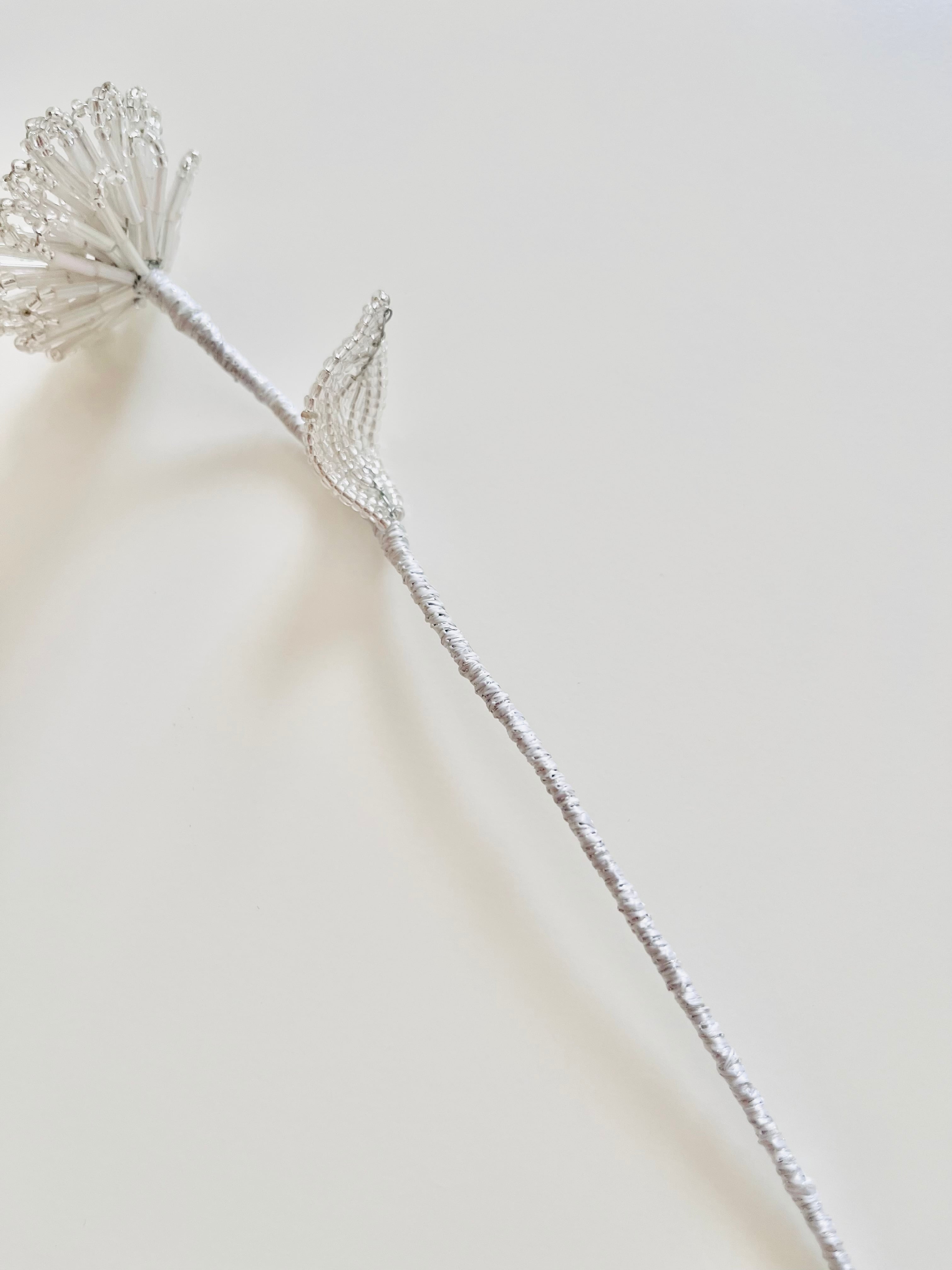 このwhite&silver ビーズフラワーは、花、葉っぱ、茎がすべて白とシルバーカラーで統一され、シンプルながらもエレガントな印象を与えます。どんな空間にも溶け込み、上品な雰囲気を漂わせてくれるため、リビングや寝室、オフィスなど様々な場所でご使用いただけます。