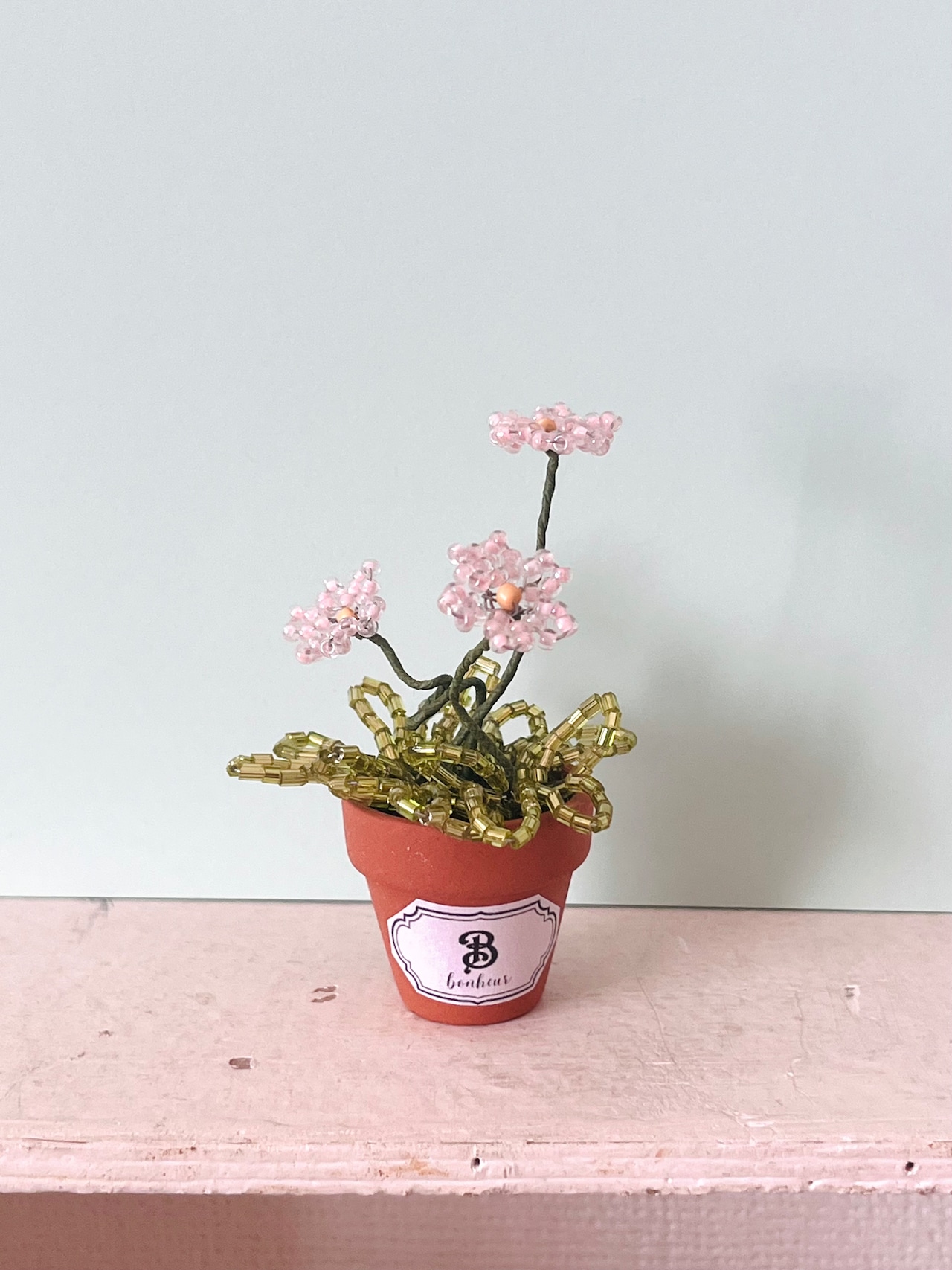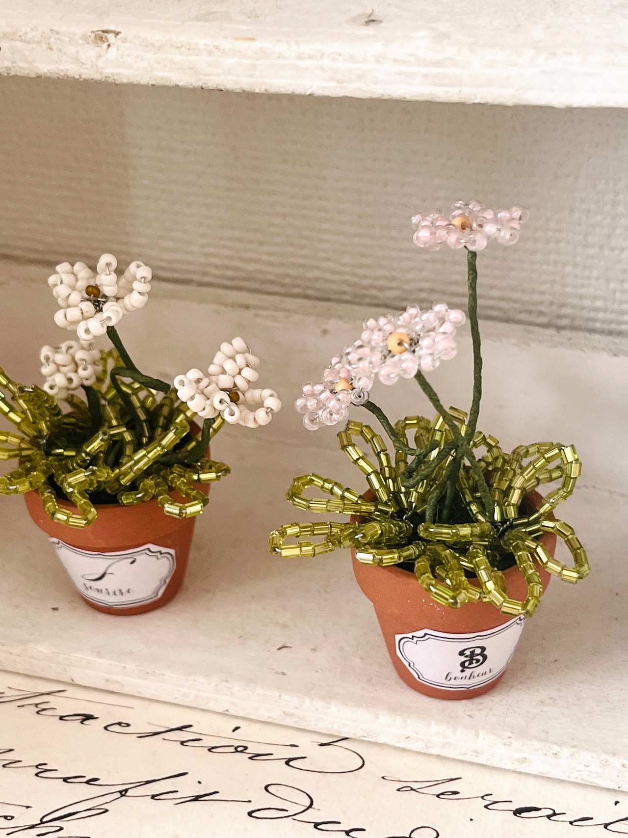 このミニチュアフラワーは、小さな植木鉢に可愛らしいビーズフラワーが咲き誇るデザインです。