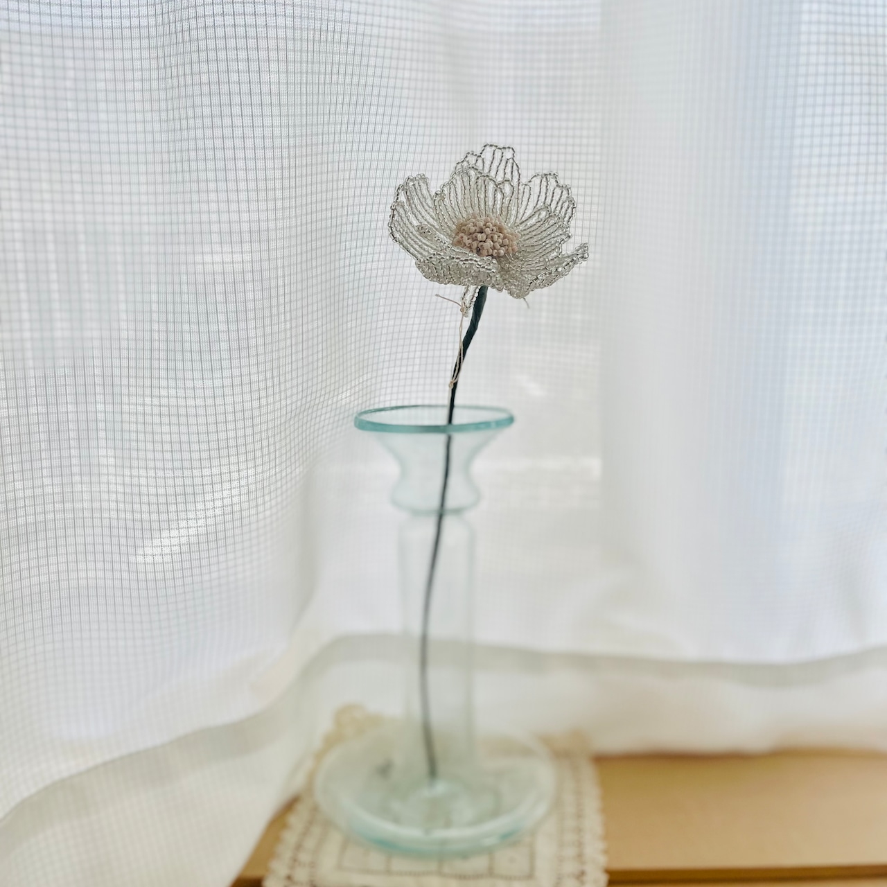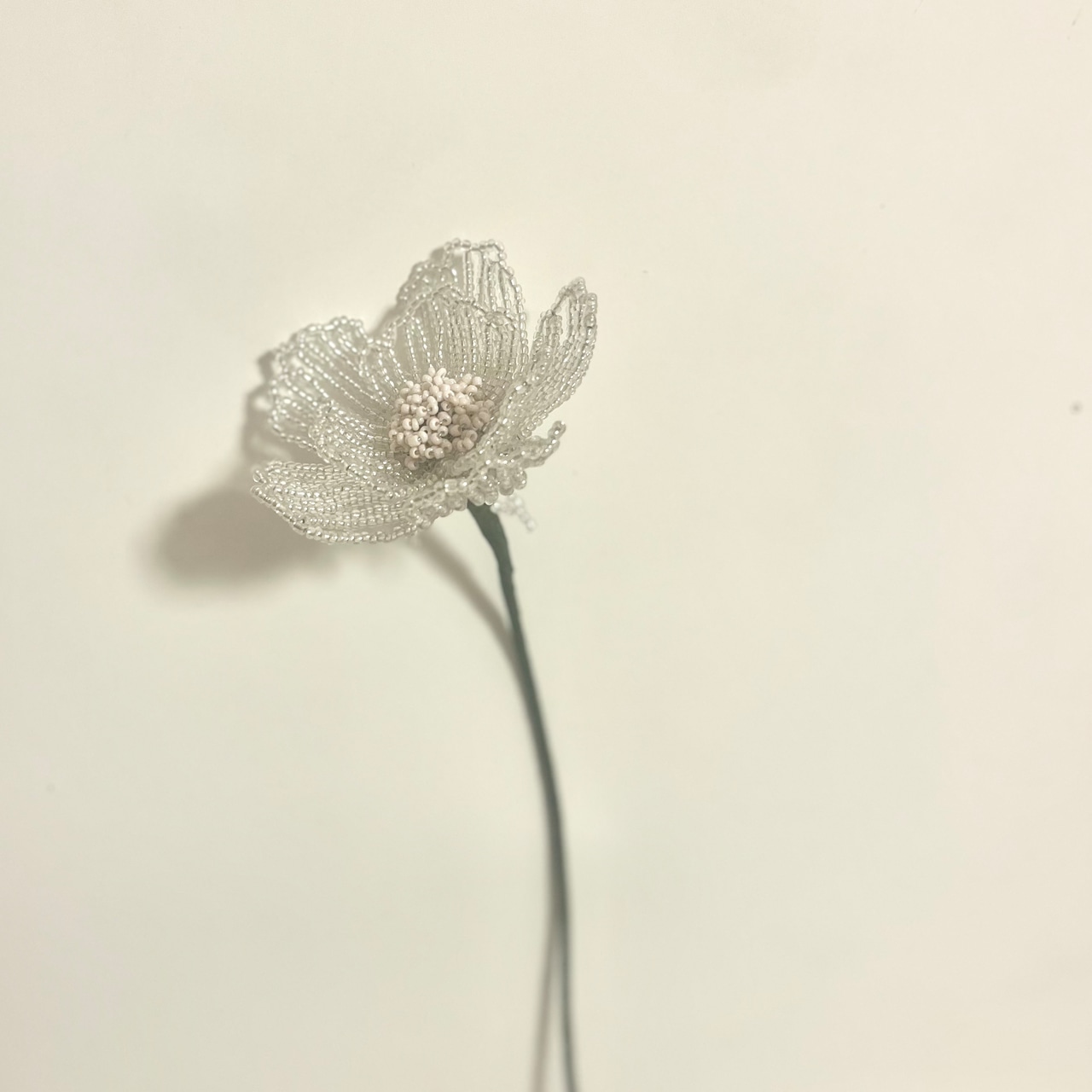 このクリアは、透明と白のビーズのみを使用したビーズフラワーです。シンプルながらも、凛とした佇まいが特徴で、光を受けることで美しい輝きを放ちます。お部屋のインテリアに取り入れることで、洗練された空間を演出し、見る人を魅了します。