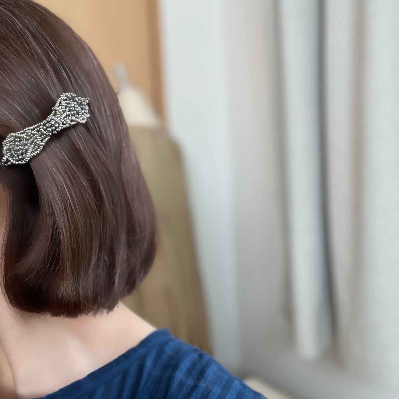 このリボンバレッタは、繊細なガラスビーズワイヤーを使って、一筆書きのように形作られたモチーフが特徴です。