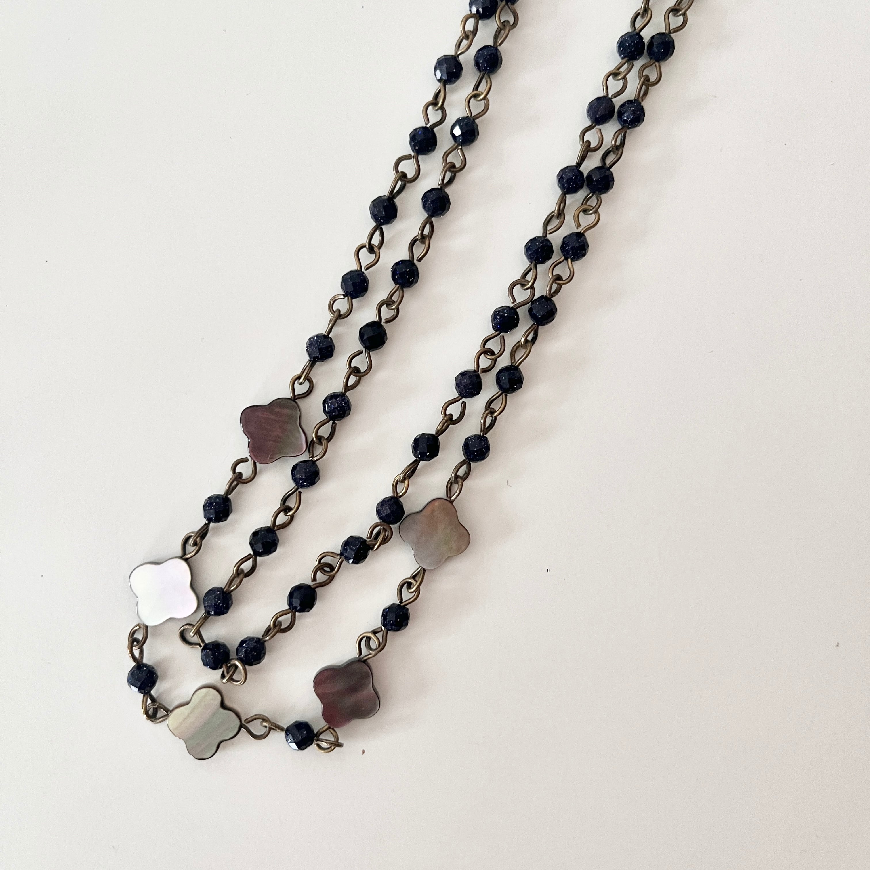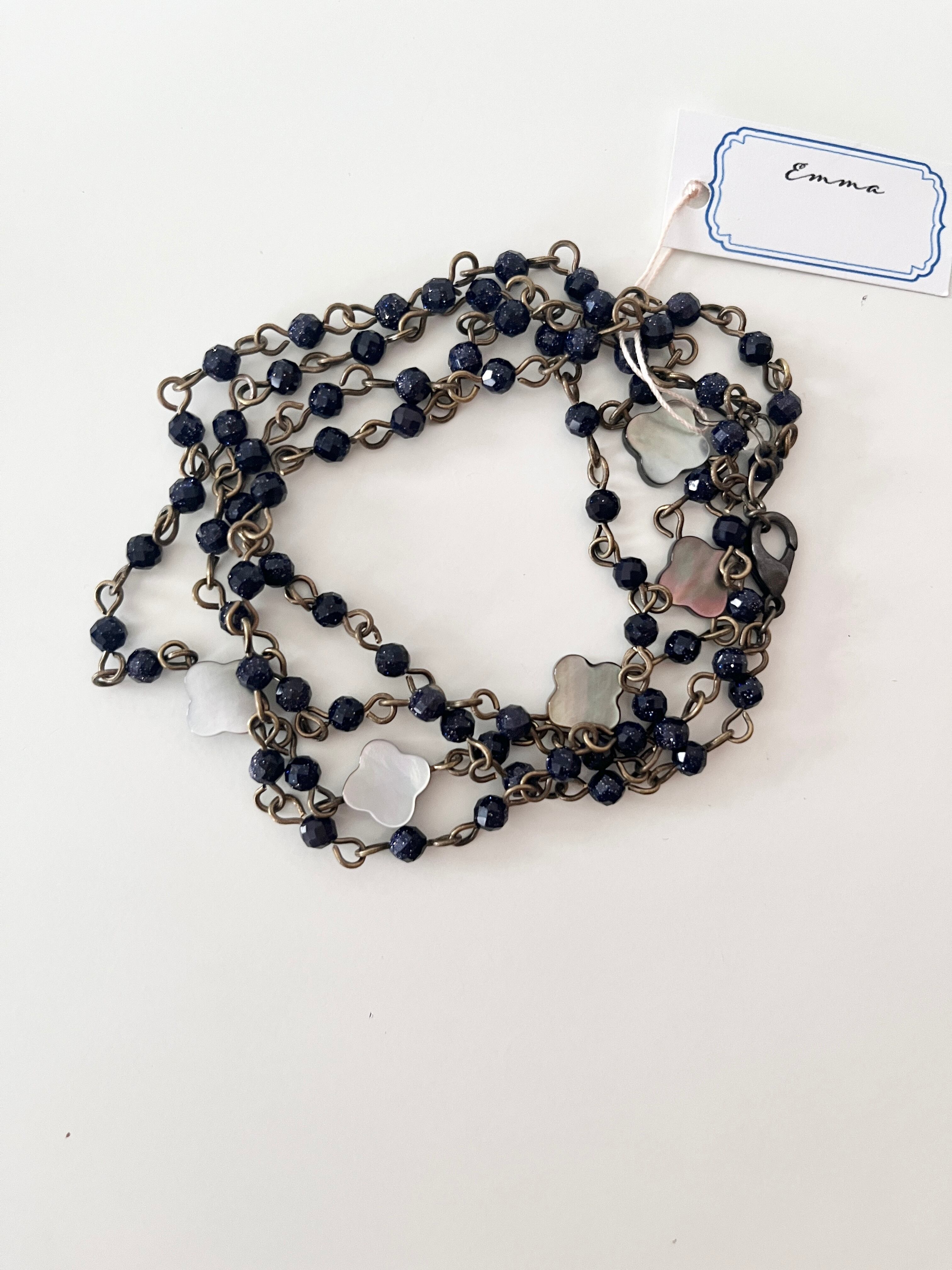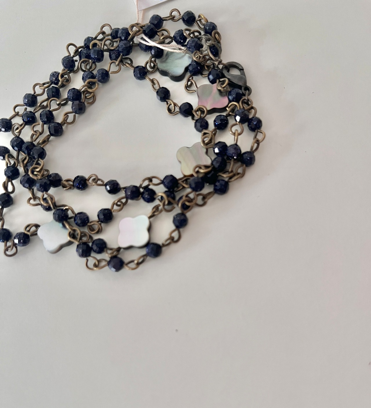 この「シェルロングネックレス」は、1連はもちろん、2連スタイルと柔軟性を持ち、さらに5連のブレスレットとしてもご利用いただけます。美しい黒蝶貝と輝きのあるブルーゴールドストーンが組み合わされており、どの角度から見ても目を引くデザインが特長です。