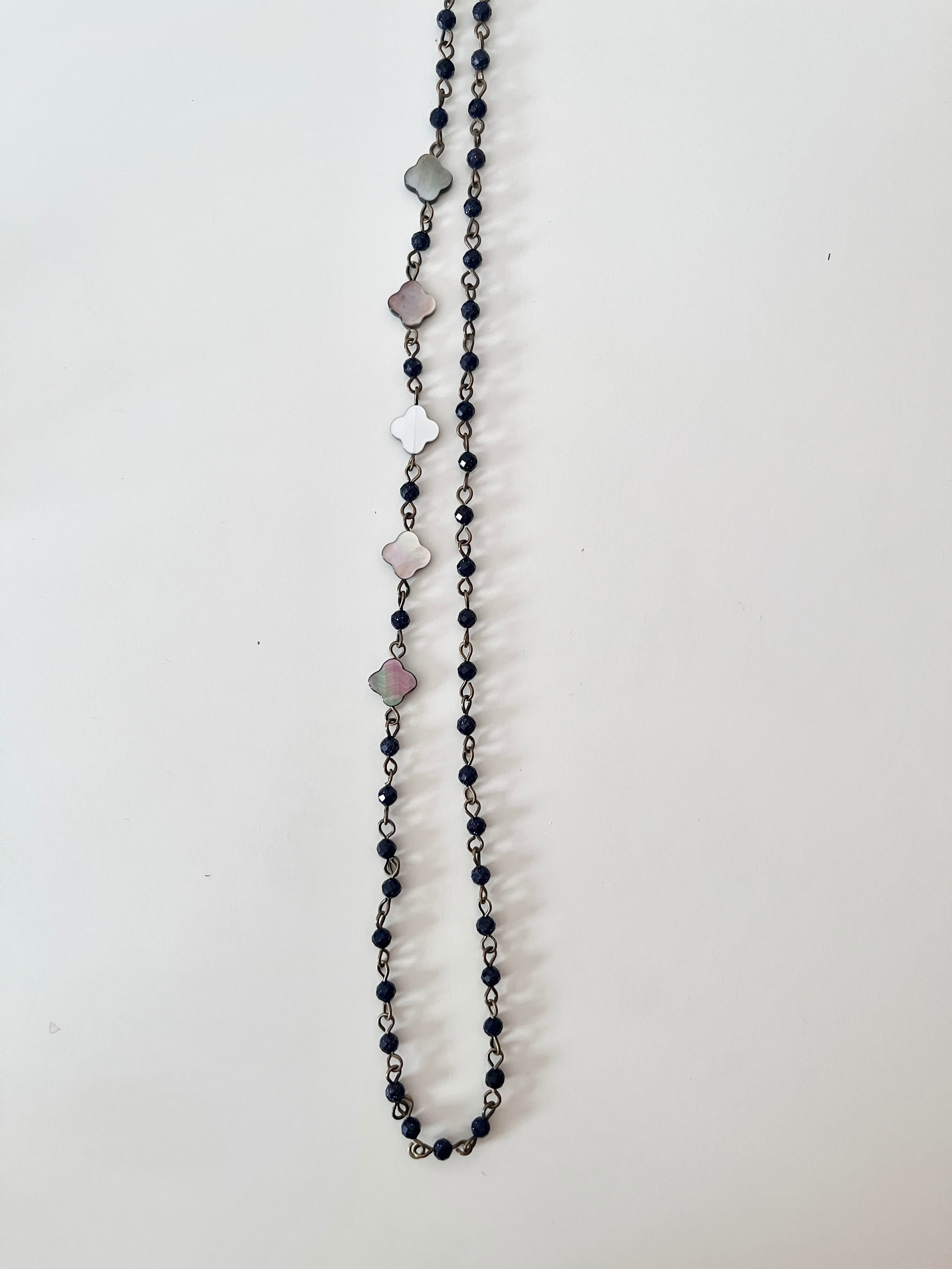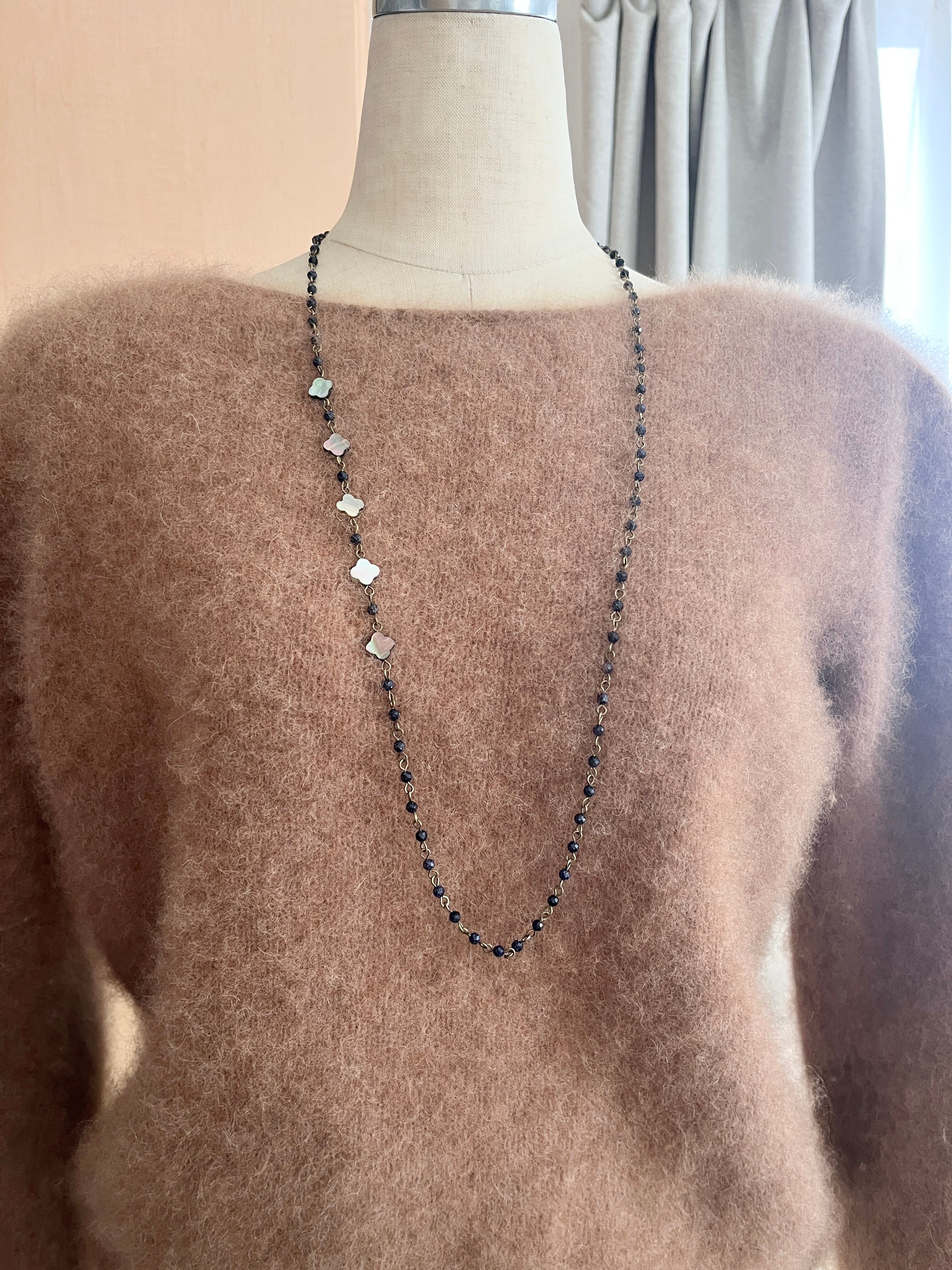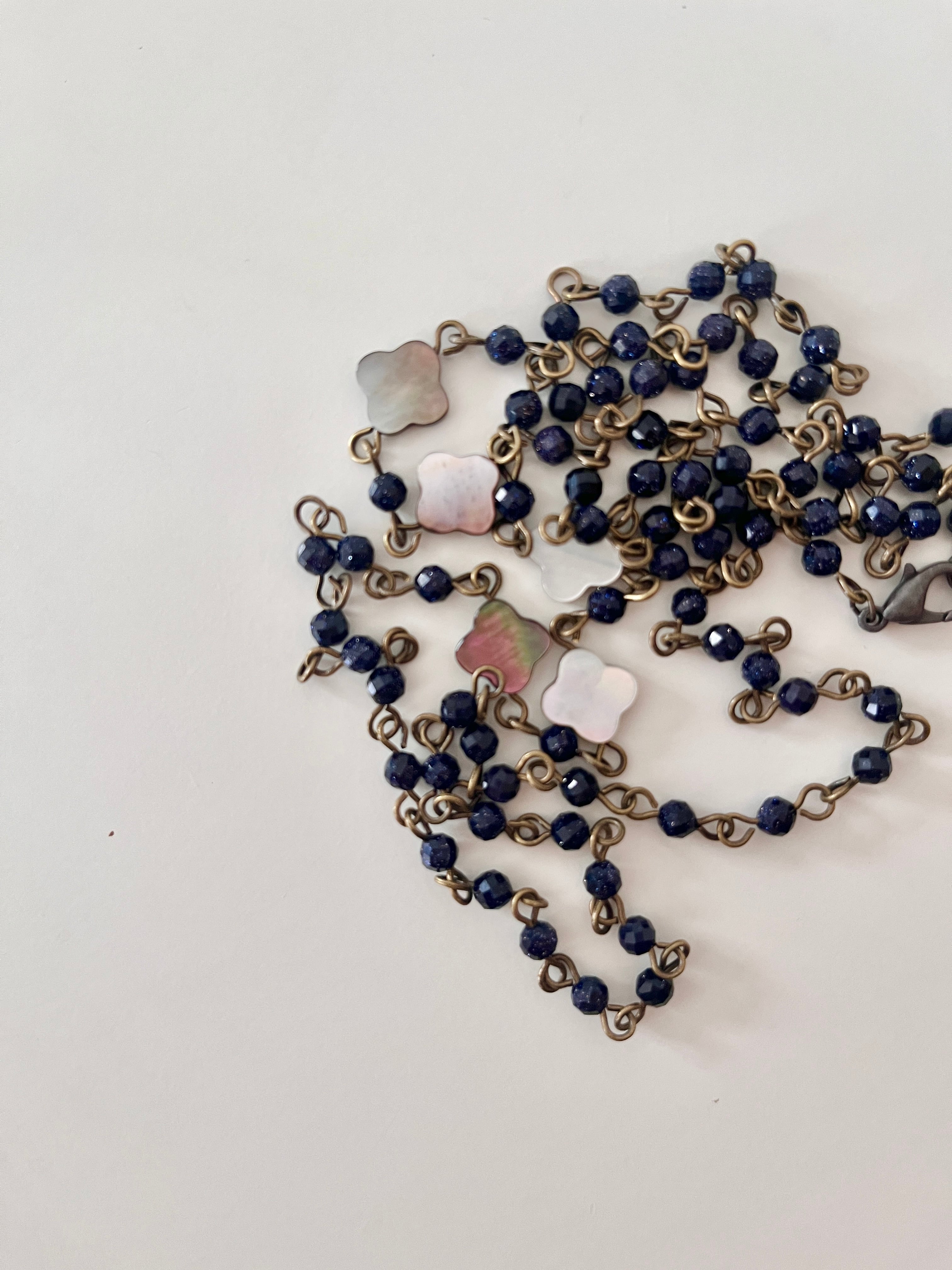 この「シェルロングネックレス」は、1連はもちろん、2連スタイルと柔軟性を持ち、さらに5連のブレスレットとしてもご利用いただけます。美しい黒蝶貝と輝きのあるブルーゴールドストーンが組み合わされており、どの角度から見ても目を引くデザインが特長です。