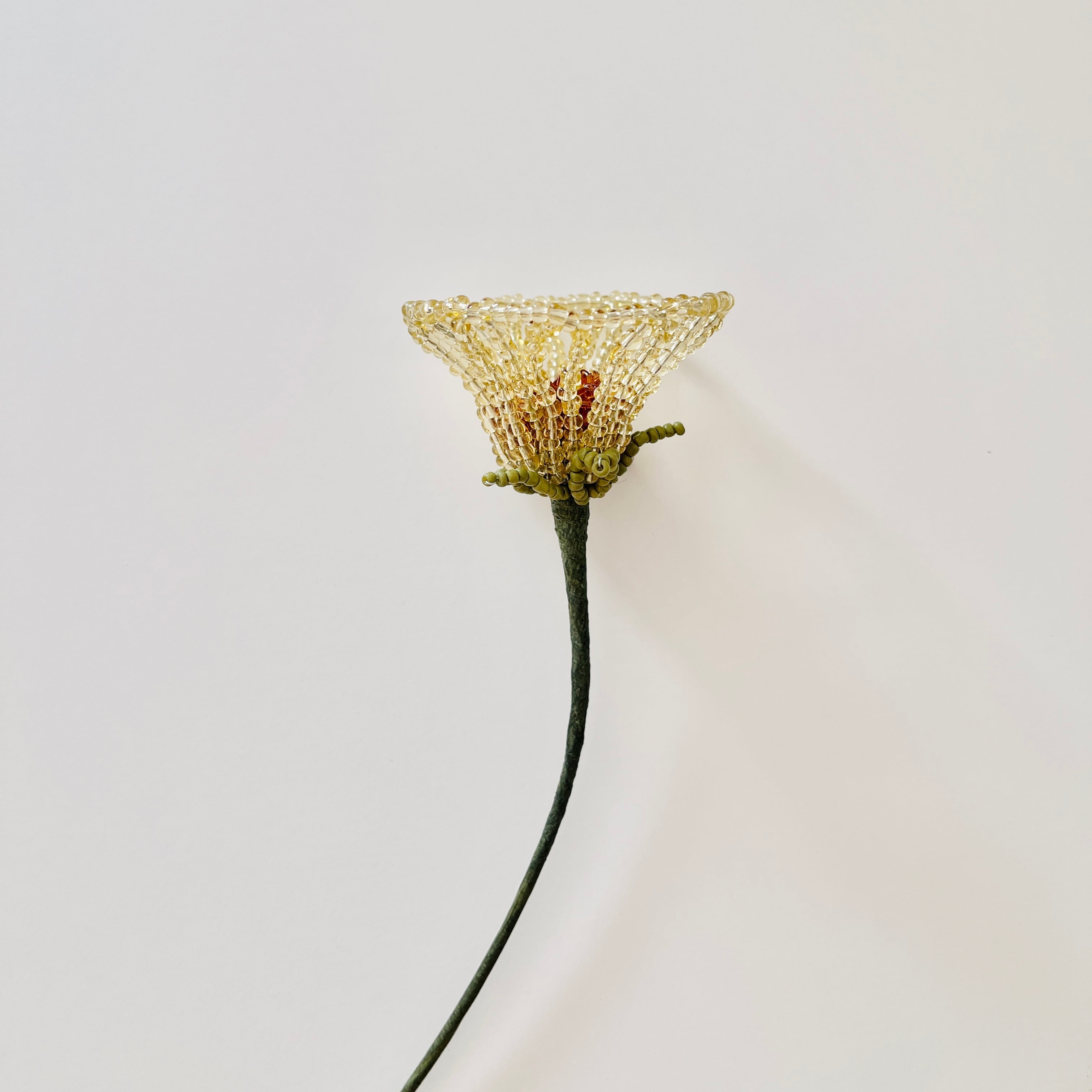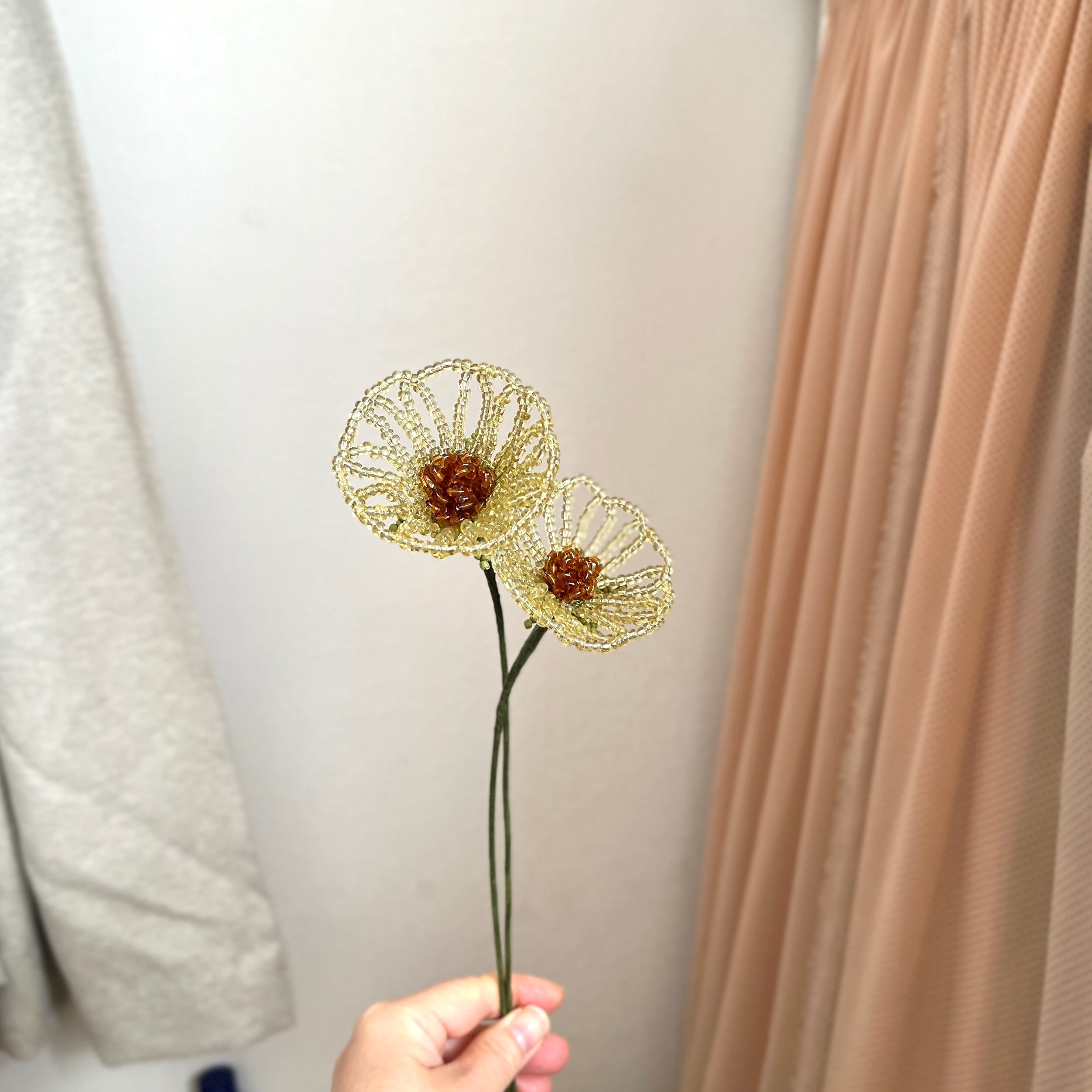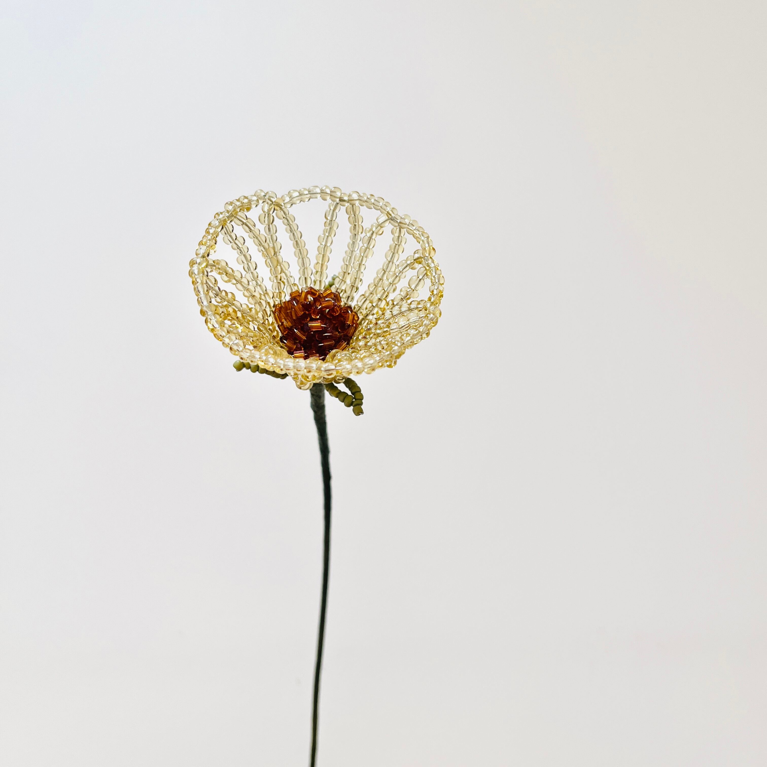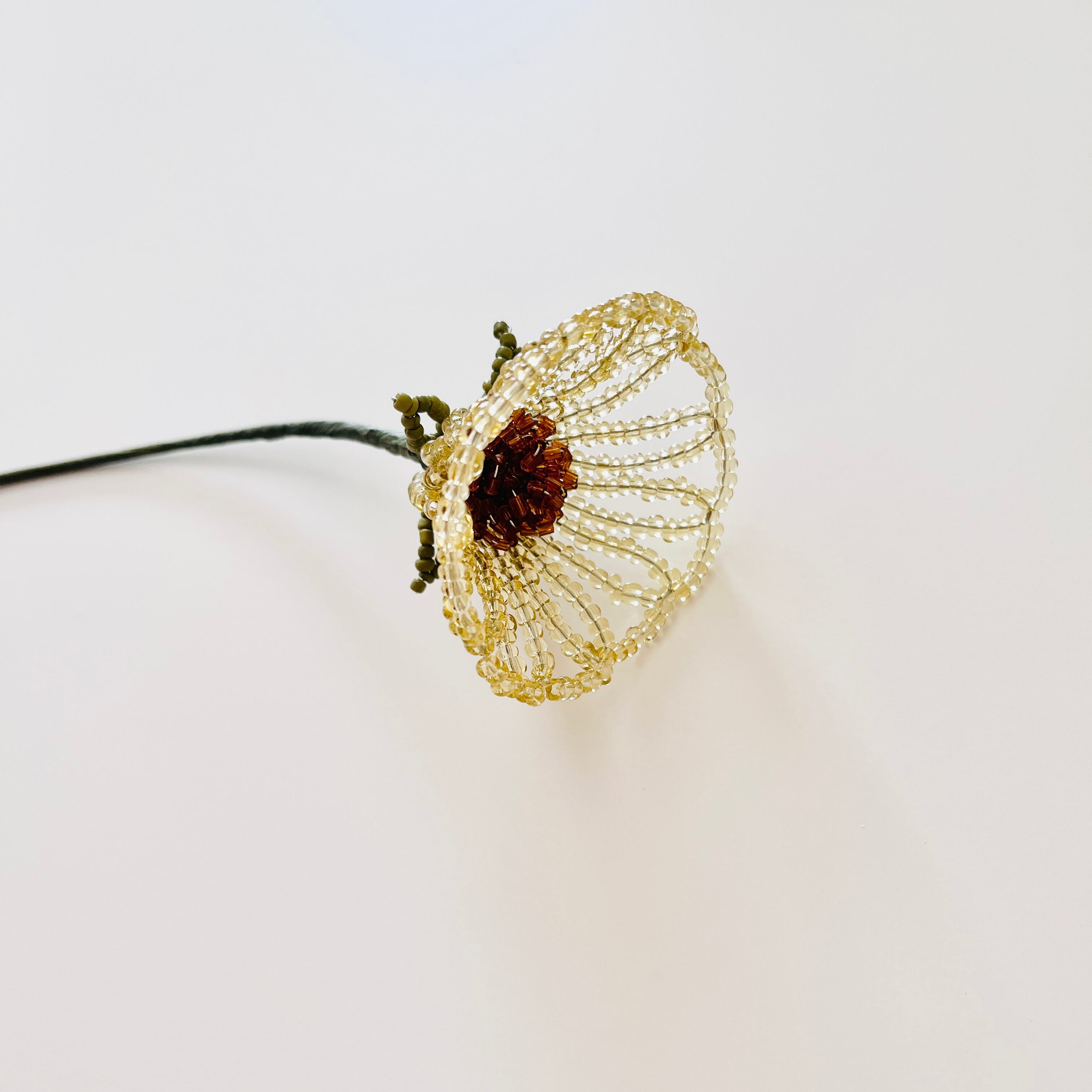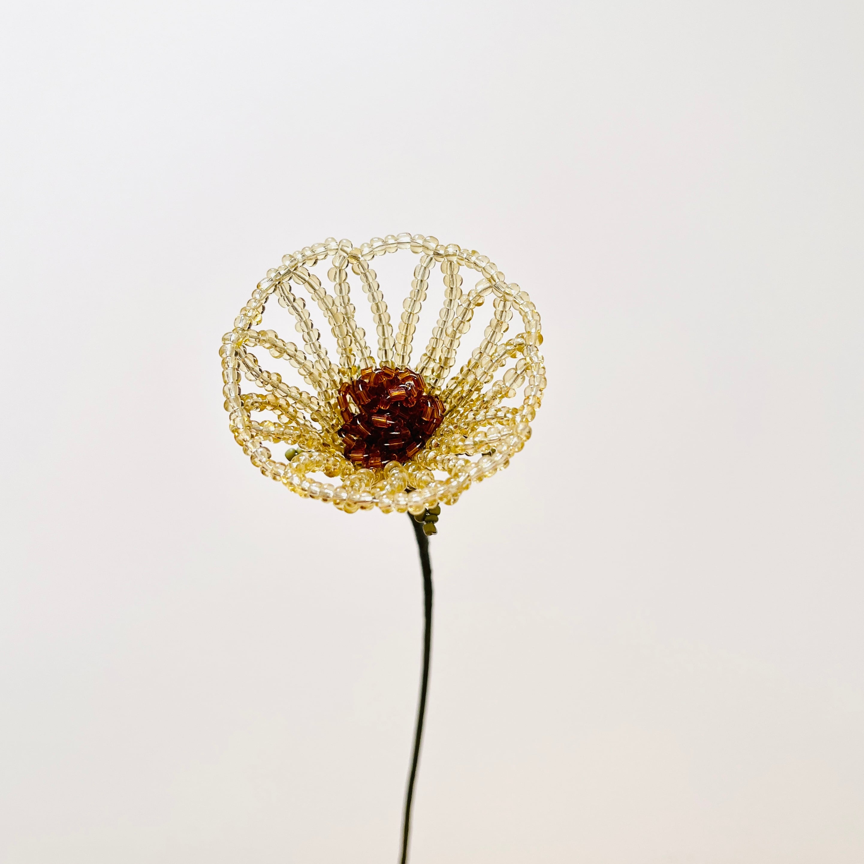 この「新whisky ビーズフラワー」は、落ち着いたウィスキー色のビーズを使用したカップ状のビーズフラワーです。凛とした佇まいがどんな場所にも贅沢な印象を与え、お部屋をエレガントに彩ります。カップ状のデザインは、見る角度によって異なる陰影を楽しむことができ、魅力的な存在感があります。