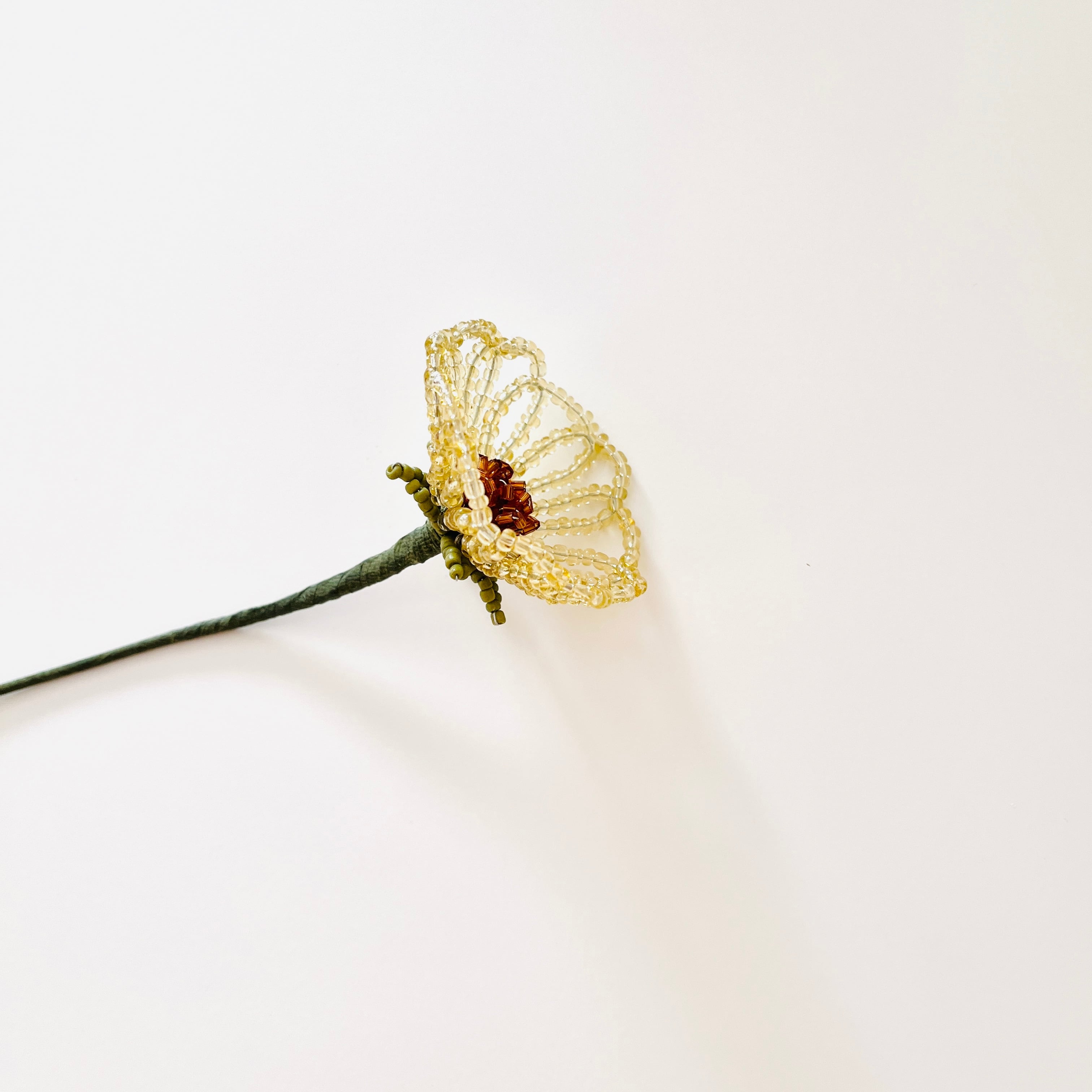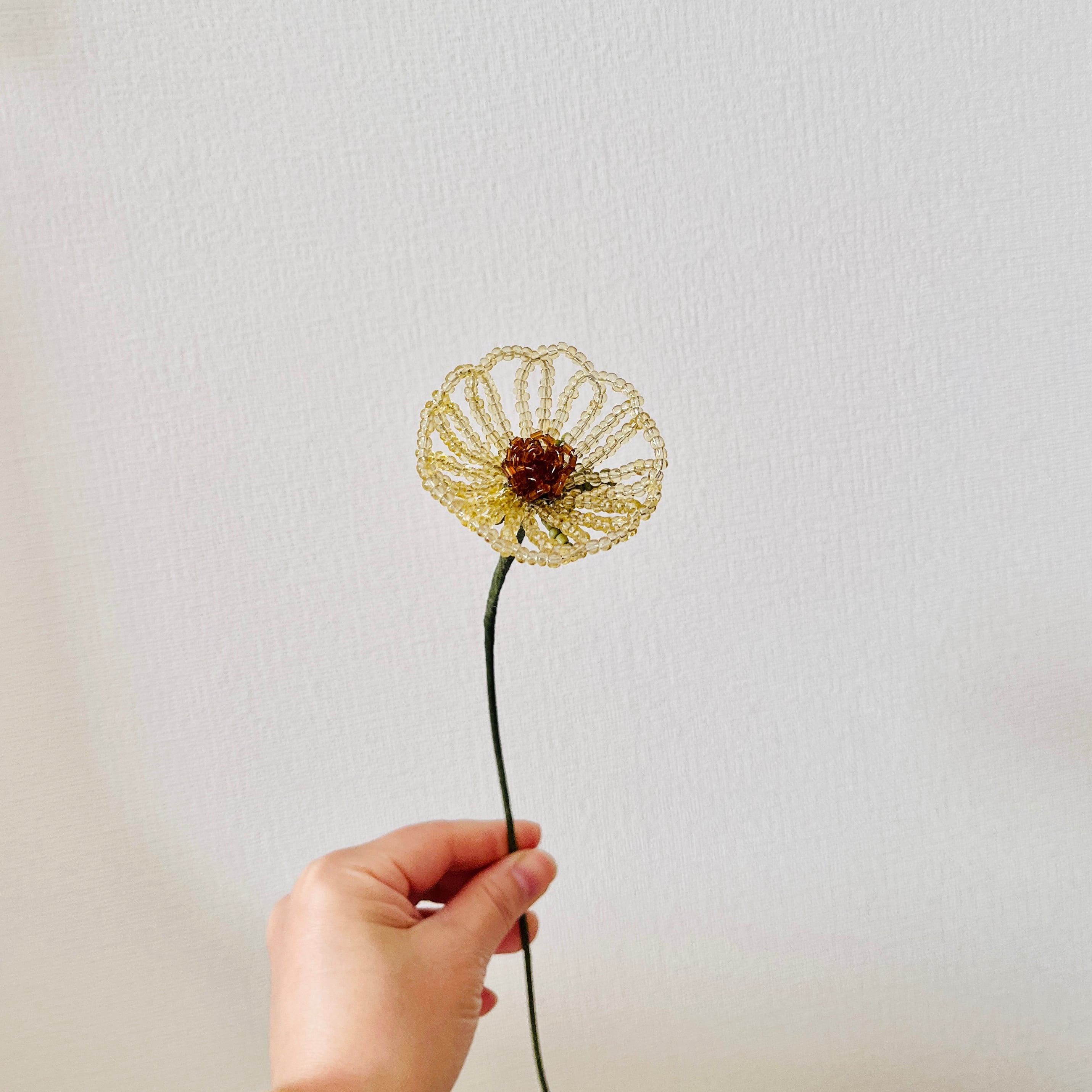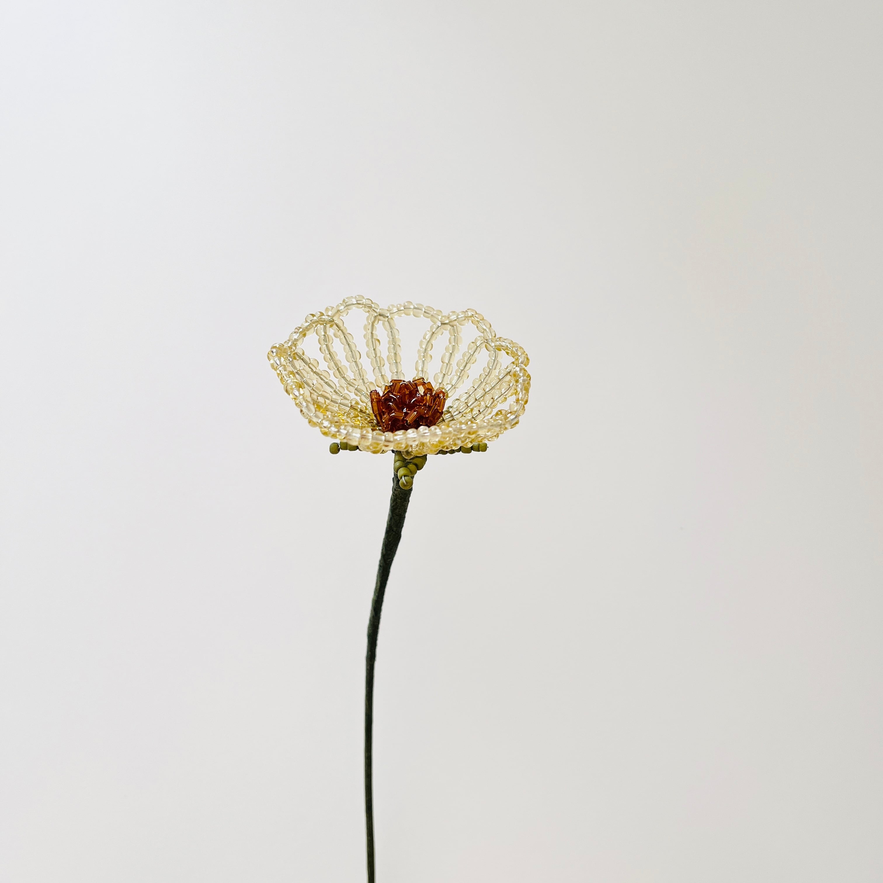 この「新whisky ビーズフラワー」は、落ち着いたウィスキー色のビーズを使用したカップ状のビーズフラワーです。凛とした佇まいがどんな場所にも贅沢な印象を与え、お部屋をエレガントに彩ります。カップ状のデザインは、見る角度によって異なる陰影を楽しむことができ、魅力的な存在感があります。
