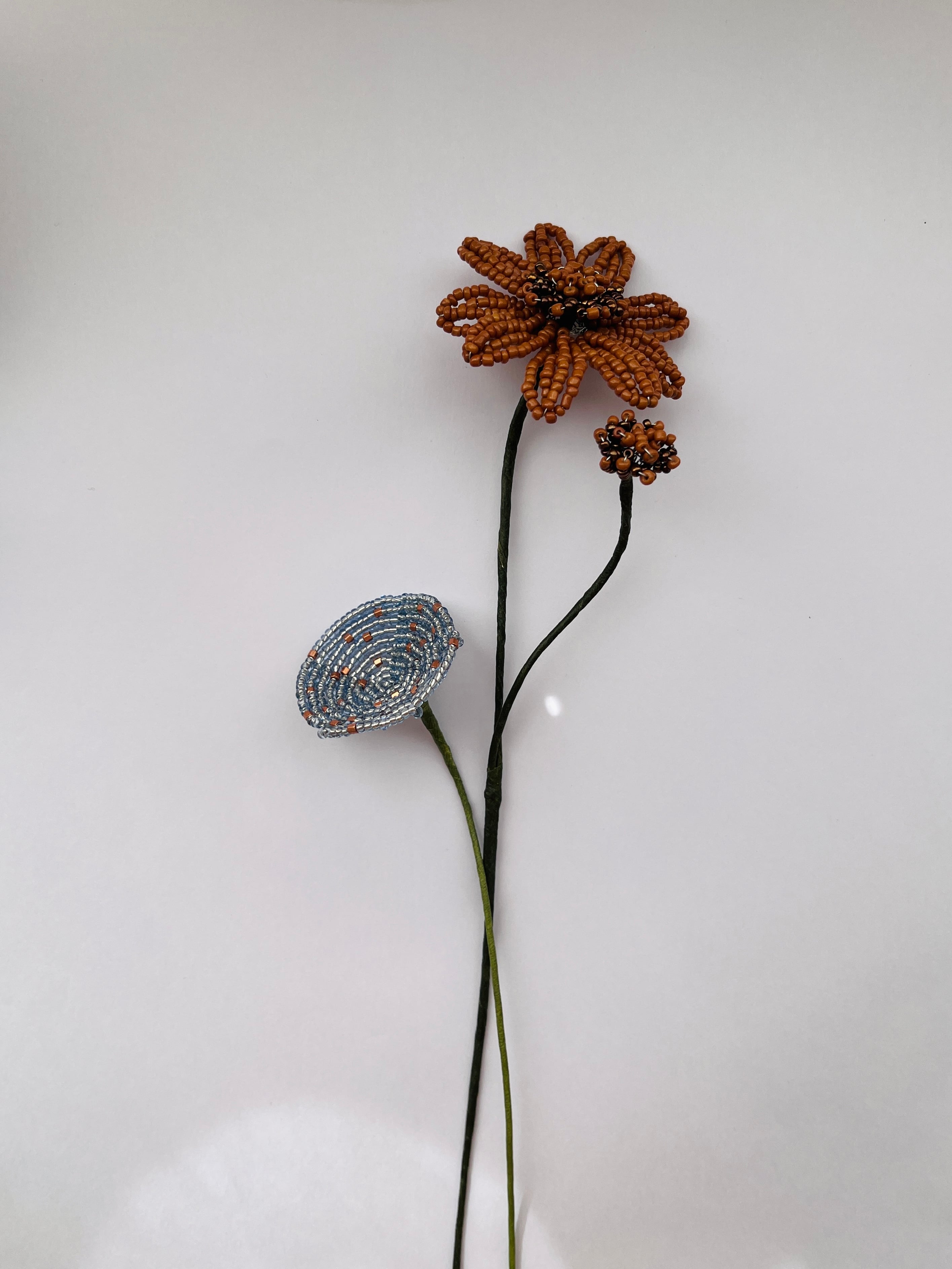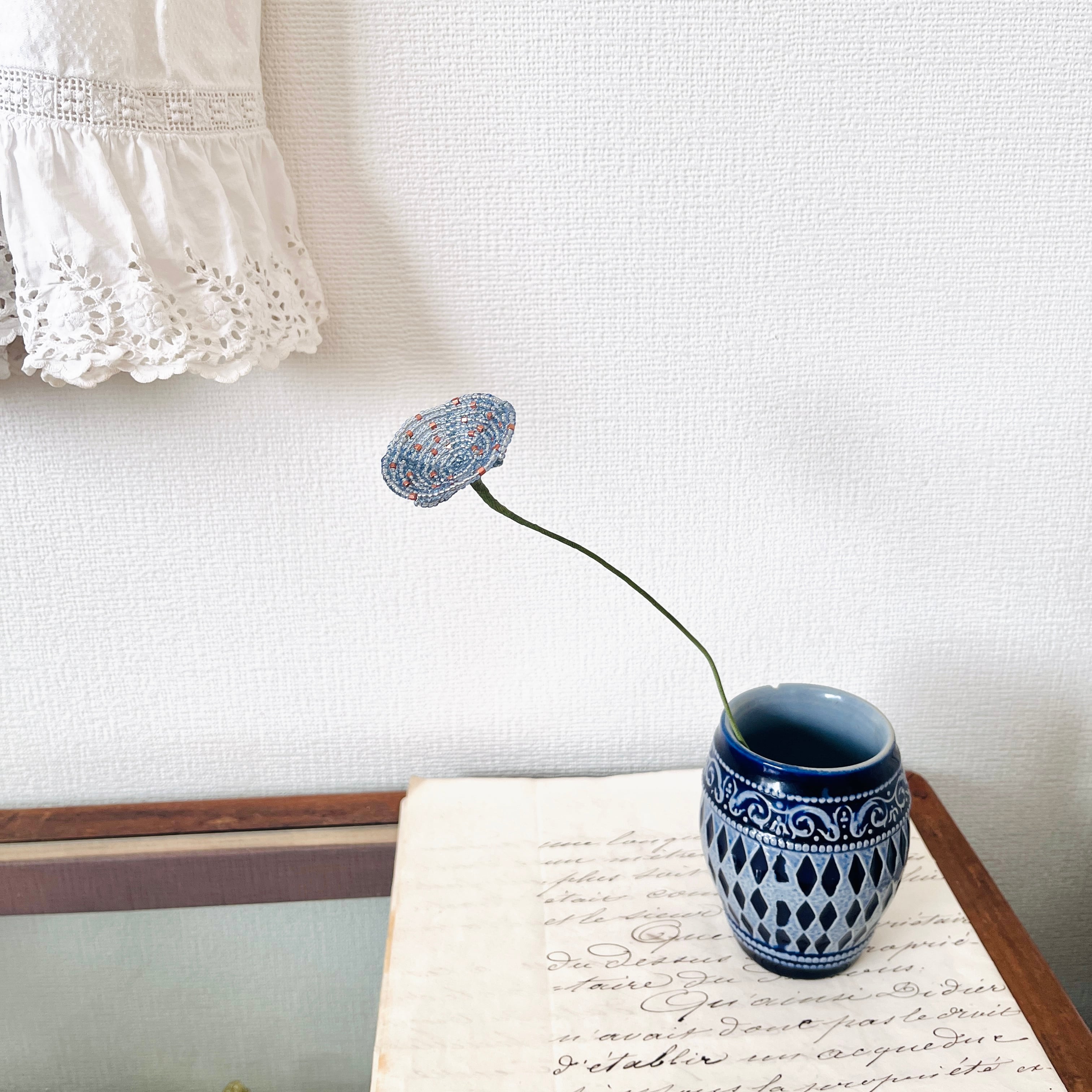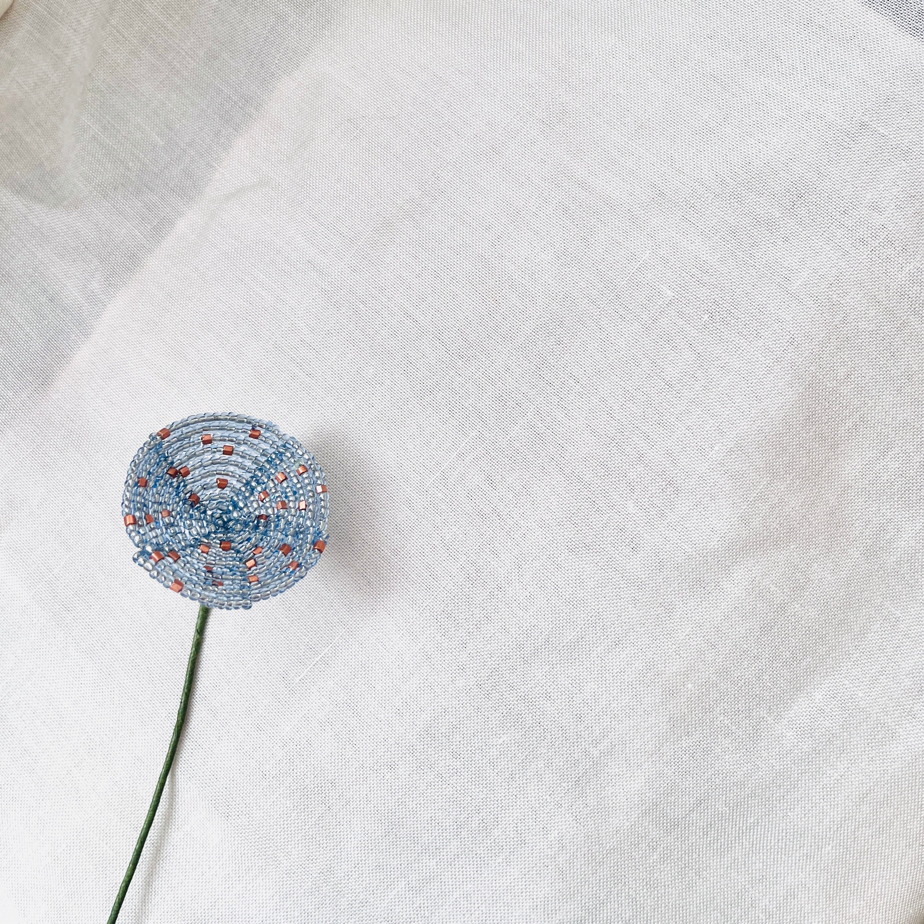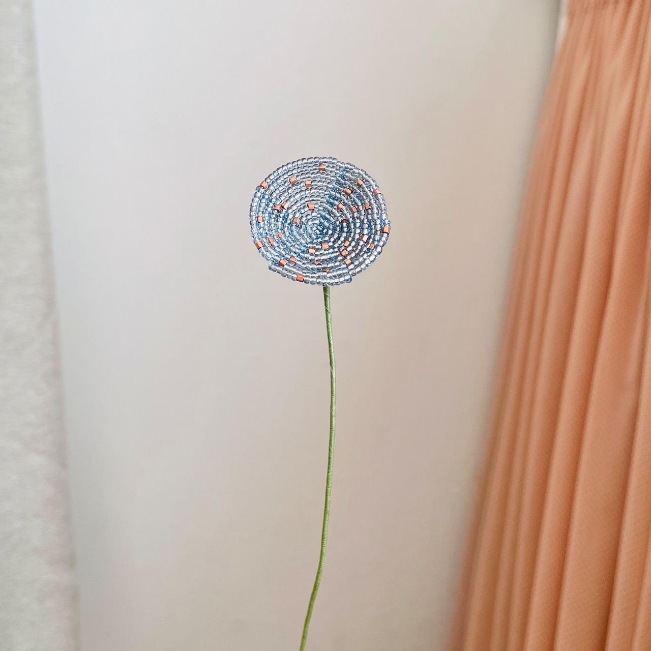 この「dot ブルーdisk ビーズフラワー」は、ひと際目を引く個性的な円盤型デザインが魅力です。角っとしたヘーゼルナッツ色のビーズは、唯一無二の風合いを持ち、お部屋を鮮やかに彩ります。飾るだけで、さまざまなシーンに華やかさをもたらし、他のお花との組み合わせでも一層豊かなアレンジを楽しむことができます。