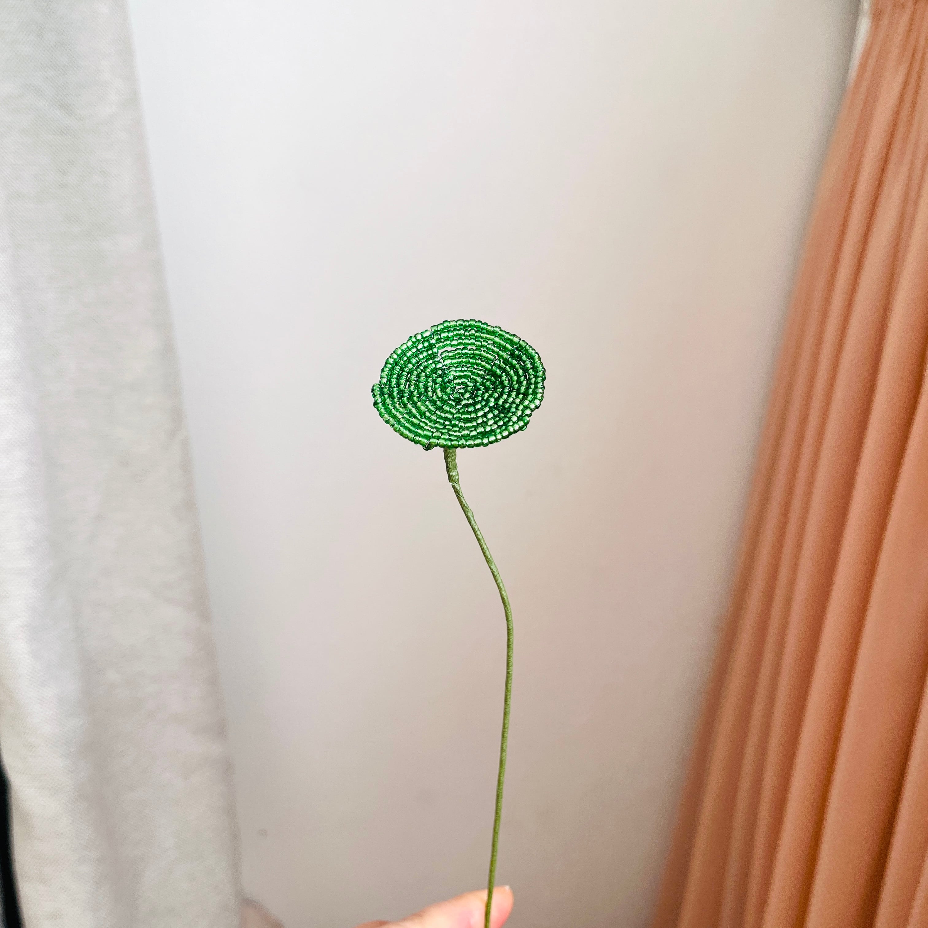 この「グリーン disk ビーズフラワー」は、葉っぱをイメージさせる円盤型デザインが魅力です。豊かなグリーンのビーズが、まるでさわやかな自然を感じさせ、お部屋に彩りを添えます。飾るだけでリフレッシュした雰囲気を作り出し、さまざまなインテリアスタイルに溶け込むことができます。他のビーズフラワーとの組み合わせも楽しめ、アレンジの幅が広がります。