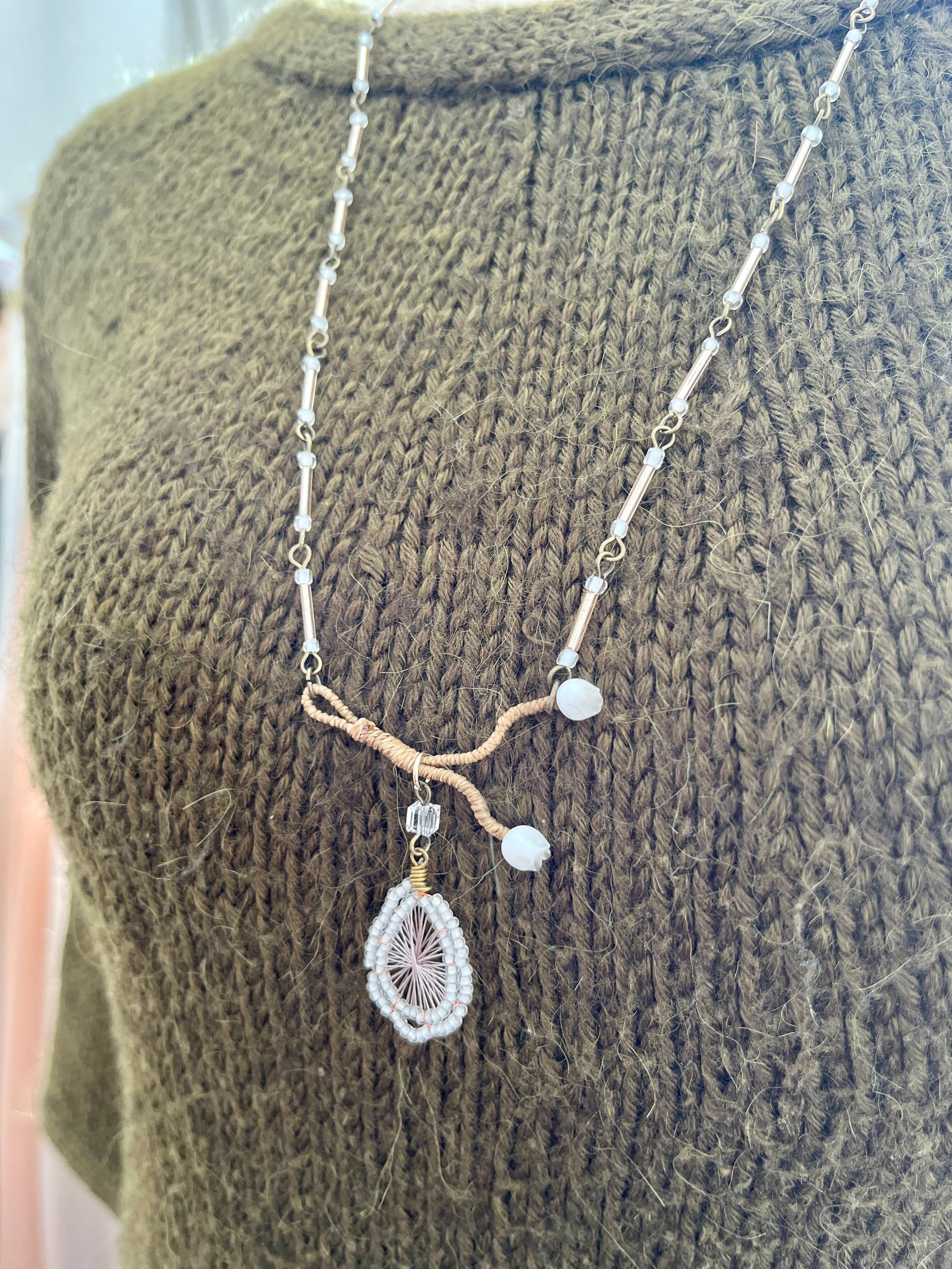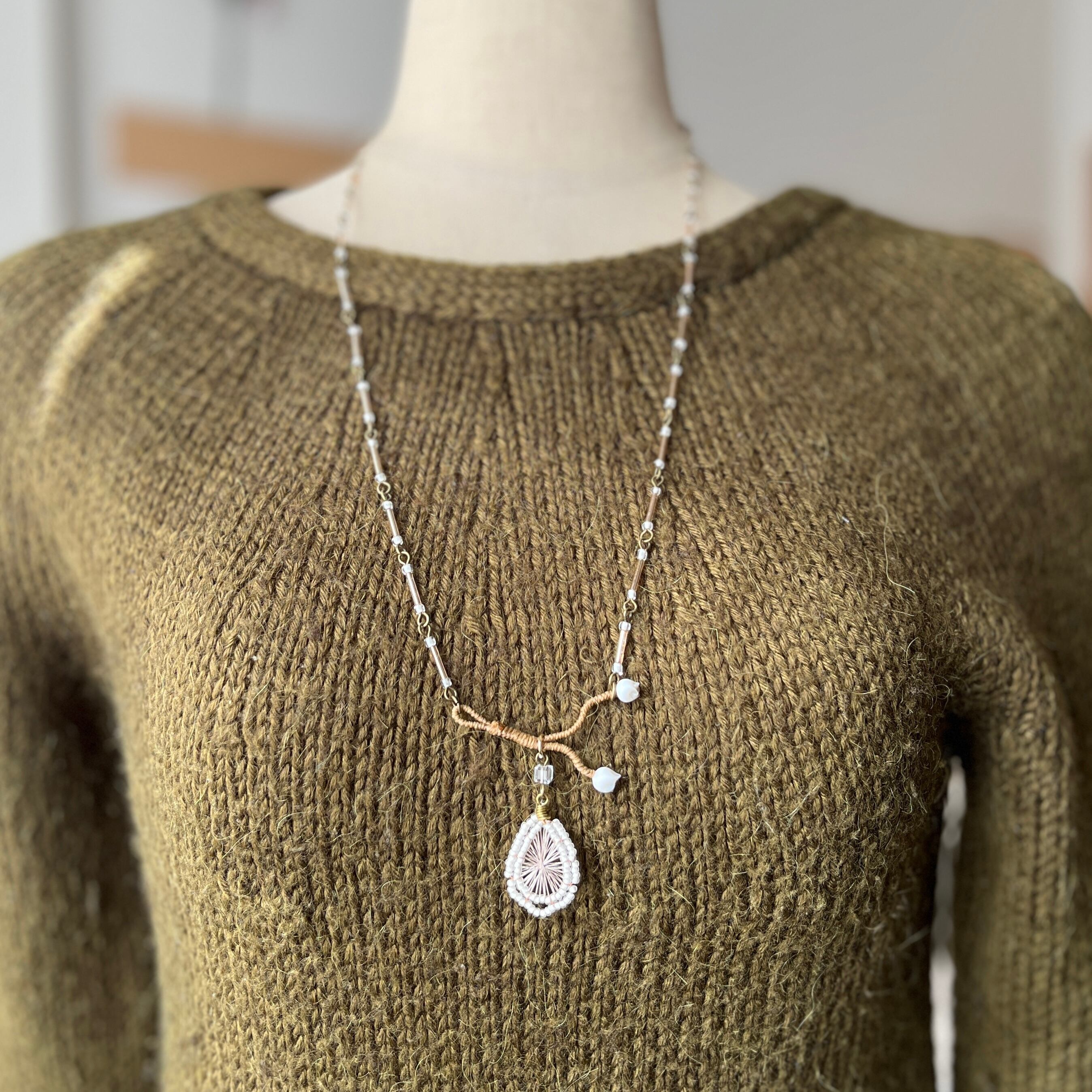 この「branch ネックレス」は、枝を形どったデザインに、愛くるしい白い蕾が施された特別なアクセサリーです。雫のトップには糸掛けのユニークなモチーフが組み合わさり、他にはない独特の魅力を放っています。1点もののポエティックなアクセサリーとして、どんなコーディネートにも個性をプラスし、あなたのスタイルを引き立てます。