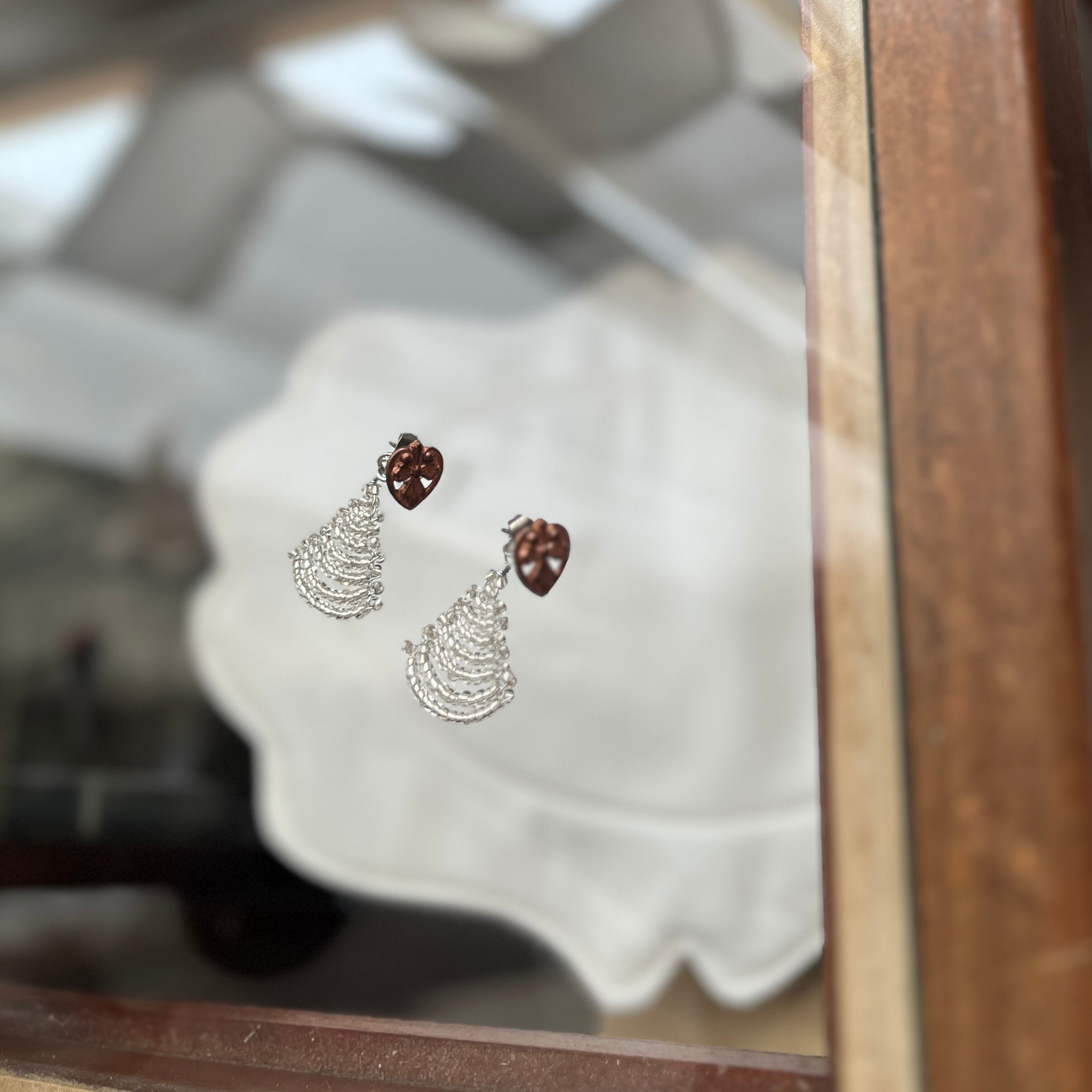 この「vintage flower ピアス」は、魅力的なヴィンテージメタルのお花と扇状のガラスビーズが特徴です。光に透けて鈍く輝くガラスビーズは、耳元で独特の雰囲気を醸し出し、特別な日にもカジュアルなお出かけにも活躍します。