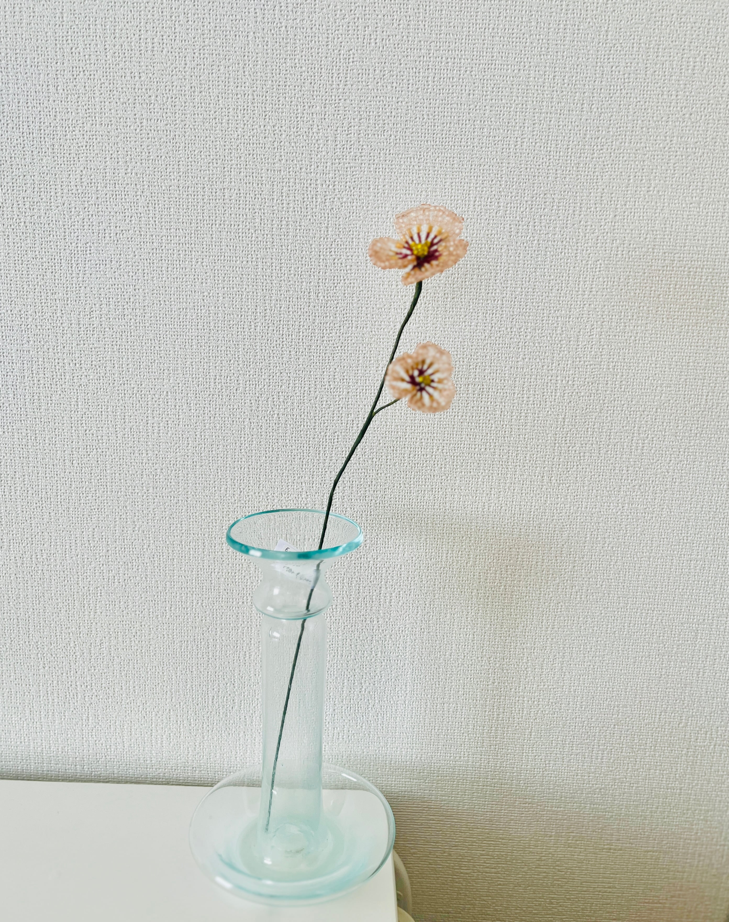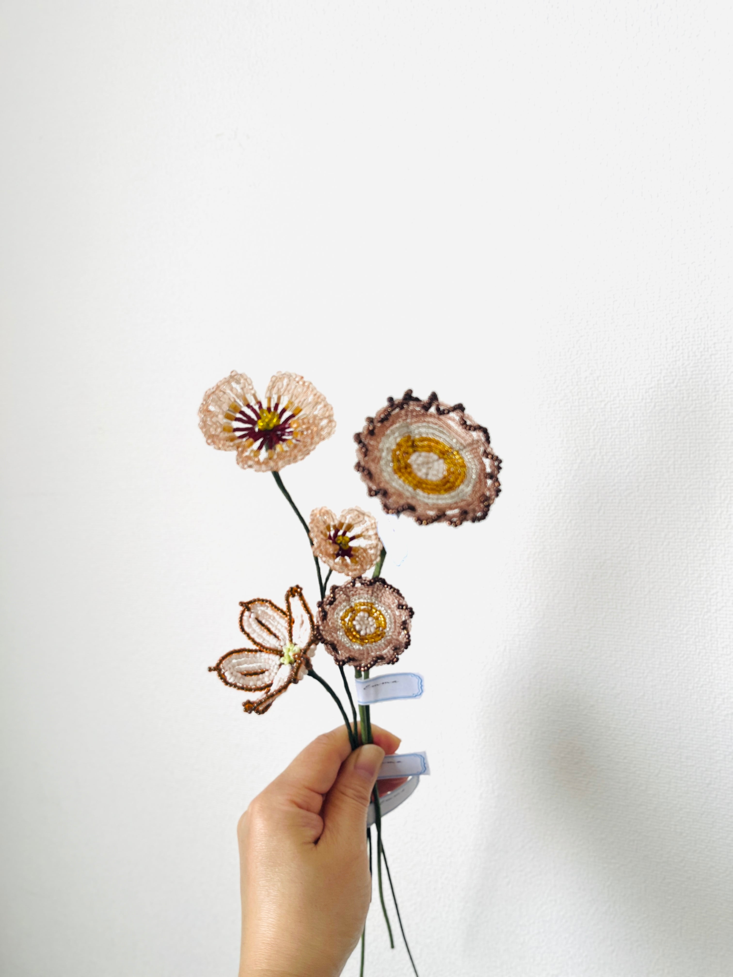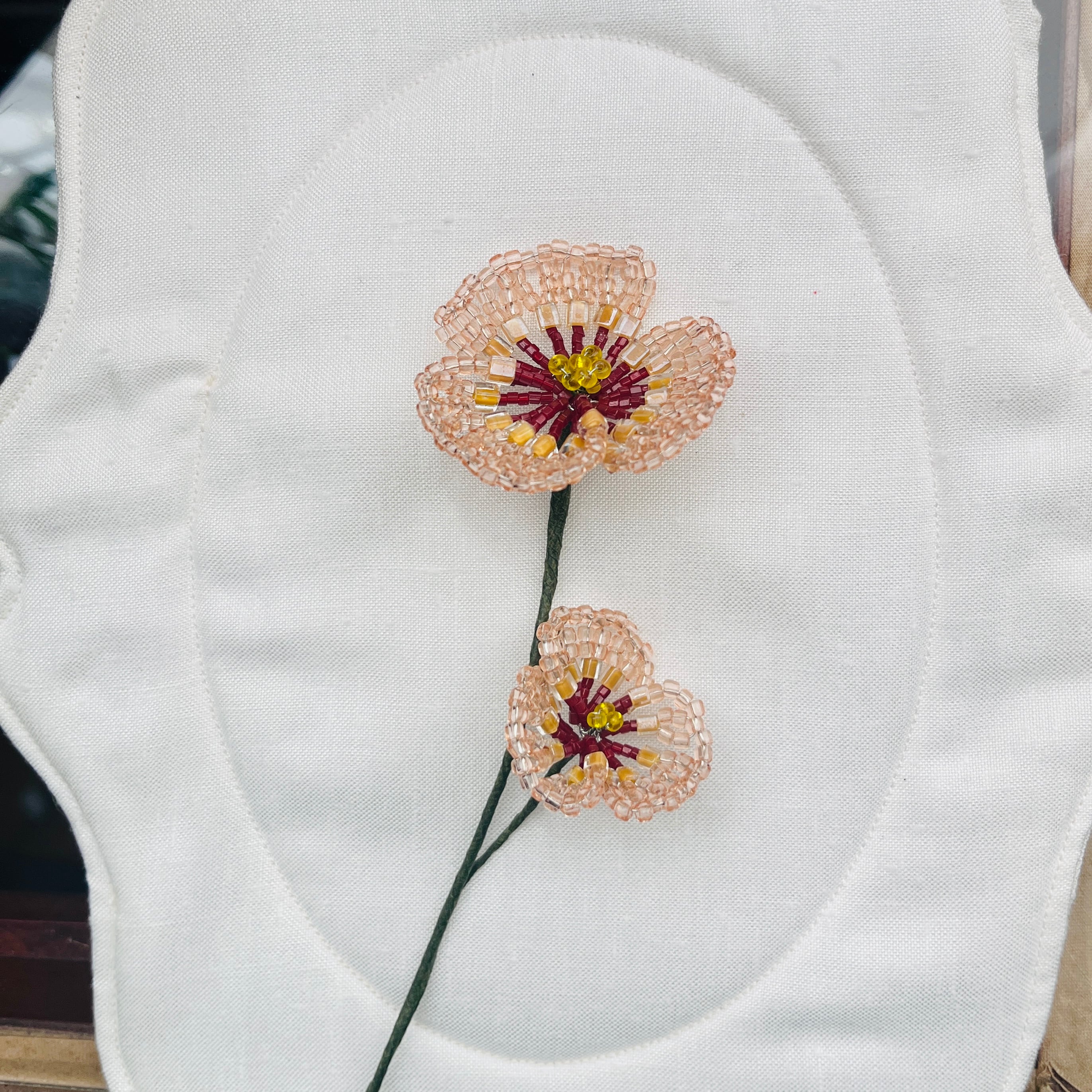 独特な風合いのヴィンテージビーズをメインに使用し、3枚花弁の優しい温もりを感じられるビーズフラワー