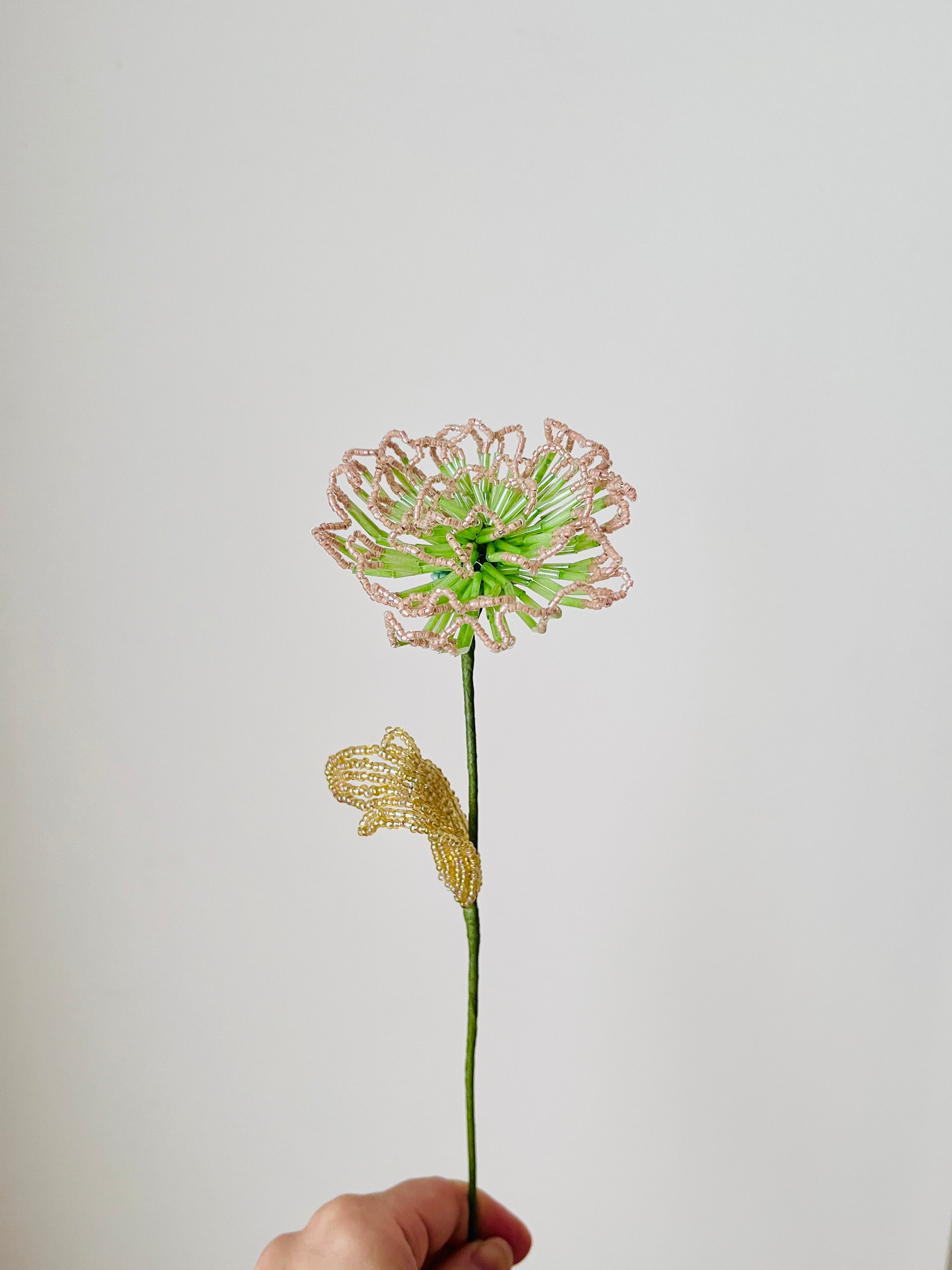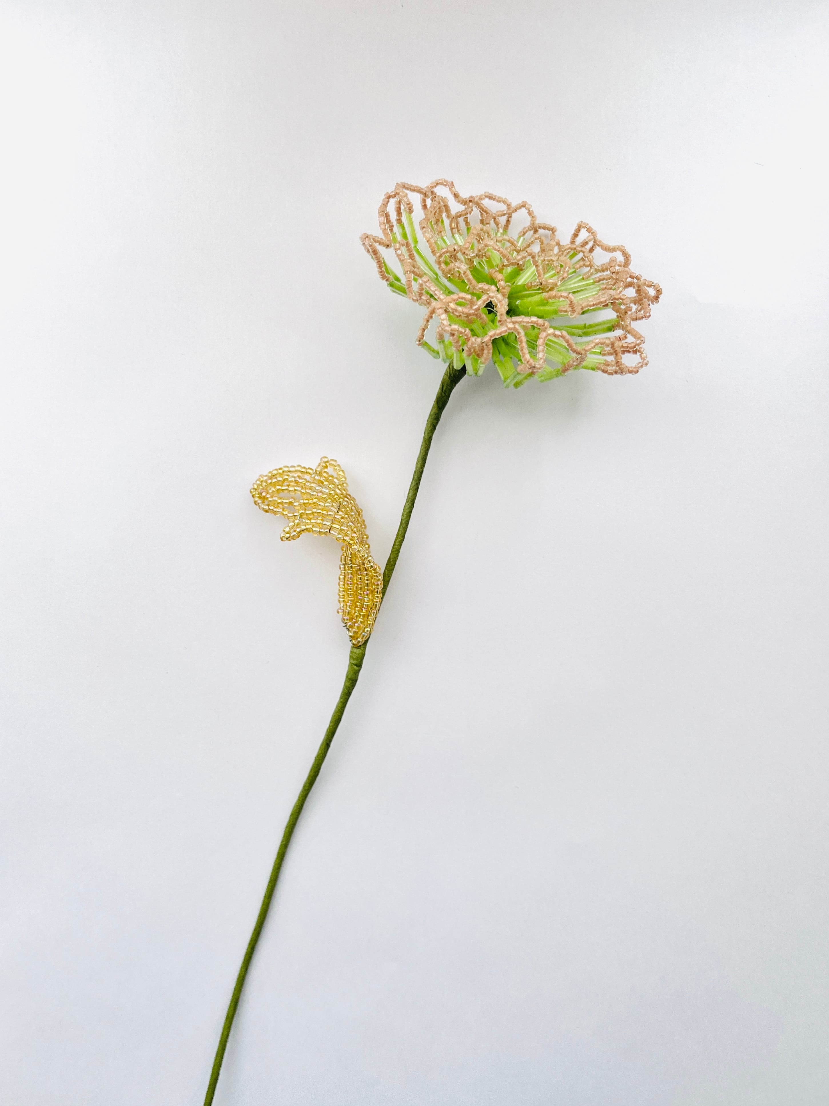 くすみピンクのフリルが魅力的な「トウコ ビーズフラワー」は、華やかさと同時に落ち着いた雰囲気を演出します。1輪だけでもその存在感を十分に発揮し、お部屋のアクセントとして最適です。シンプルながらも目を奪うデザインで、あらゆるインテリアに調和します。