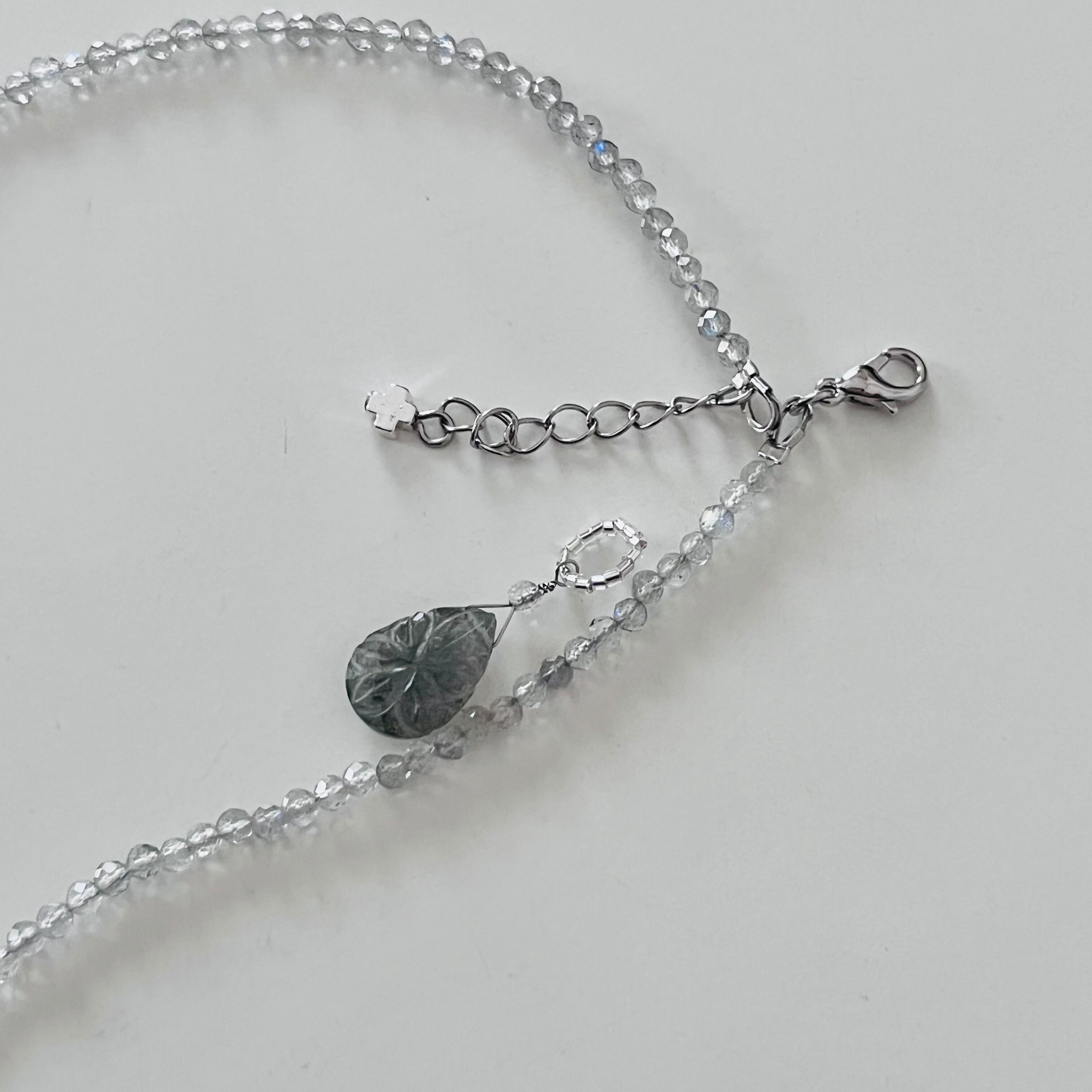 天然石ラブラドライトを使用した、2wayのトップ取り外し可能なネックレスです。ラブラドライトの美しい変色効果は、光に当たると虹色の幻想的な色合いを引き出します。