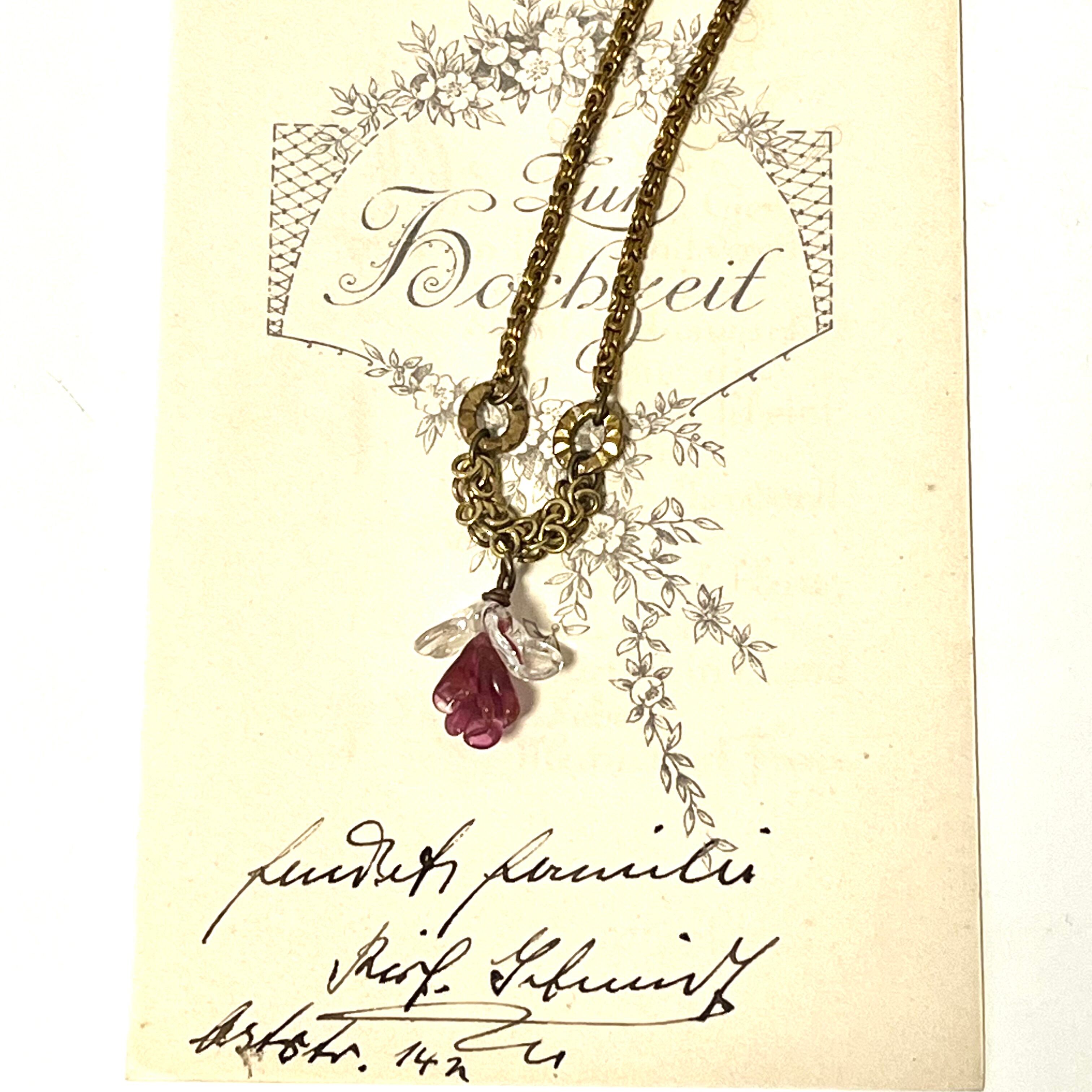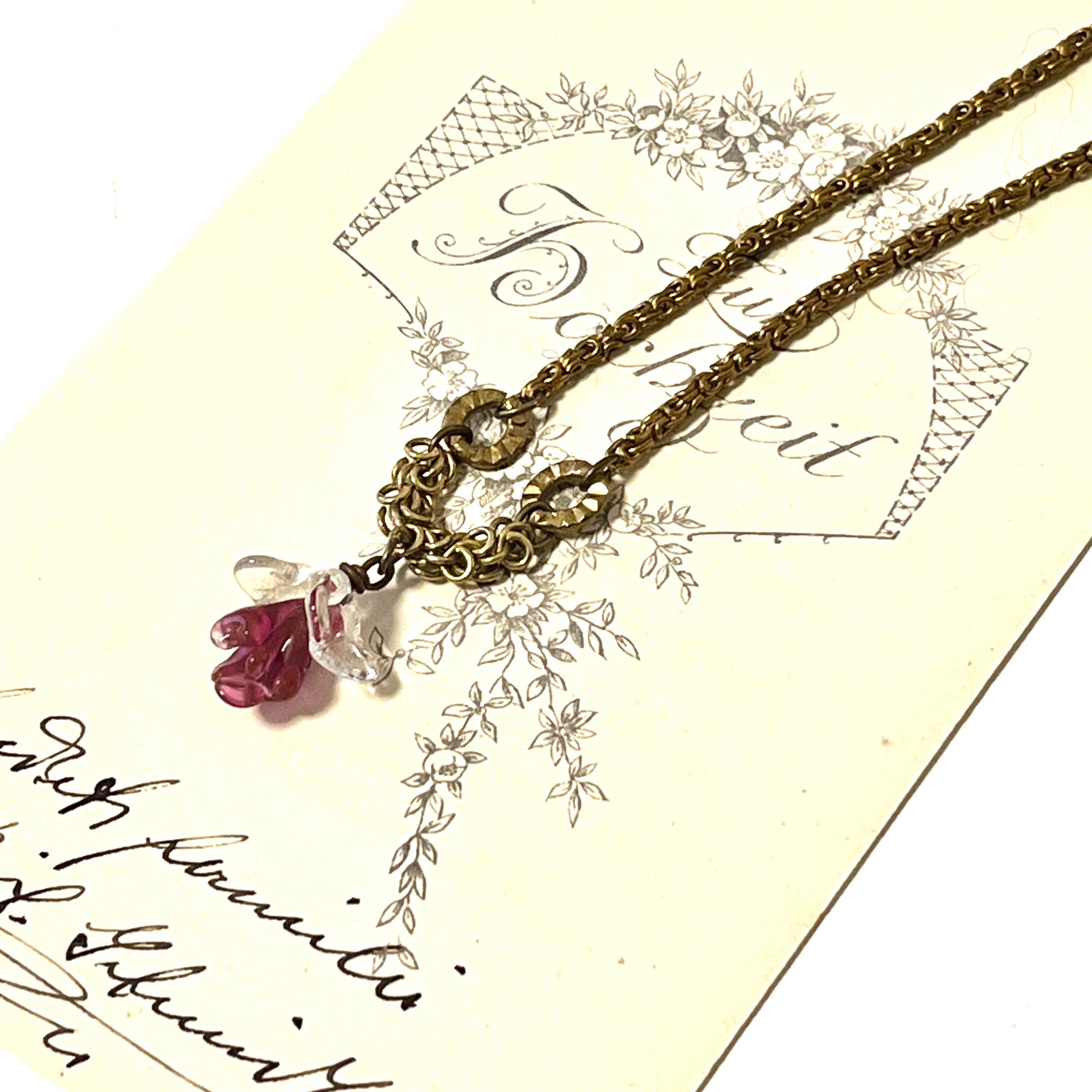 このお花のヴィンテージな雰囲気を損なわないようこだわりの真鍮チェーンを合わせました。