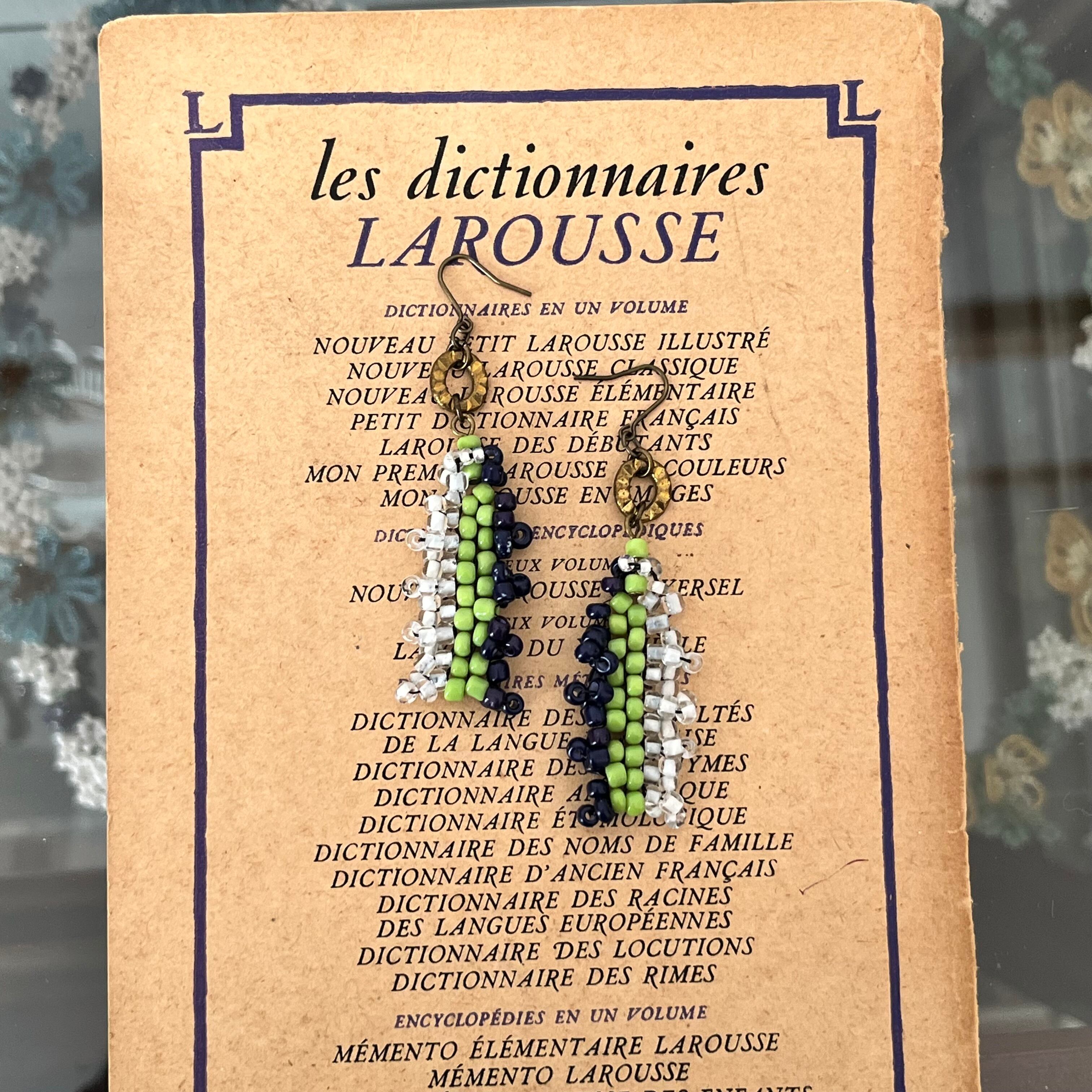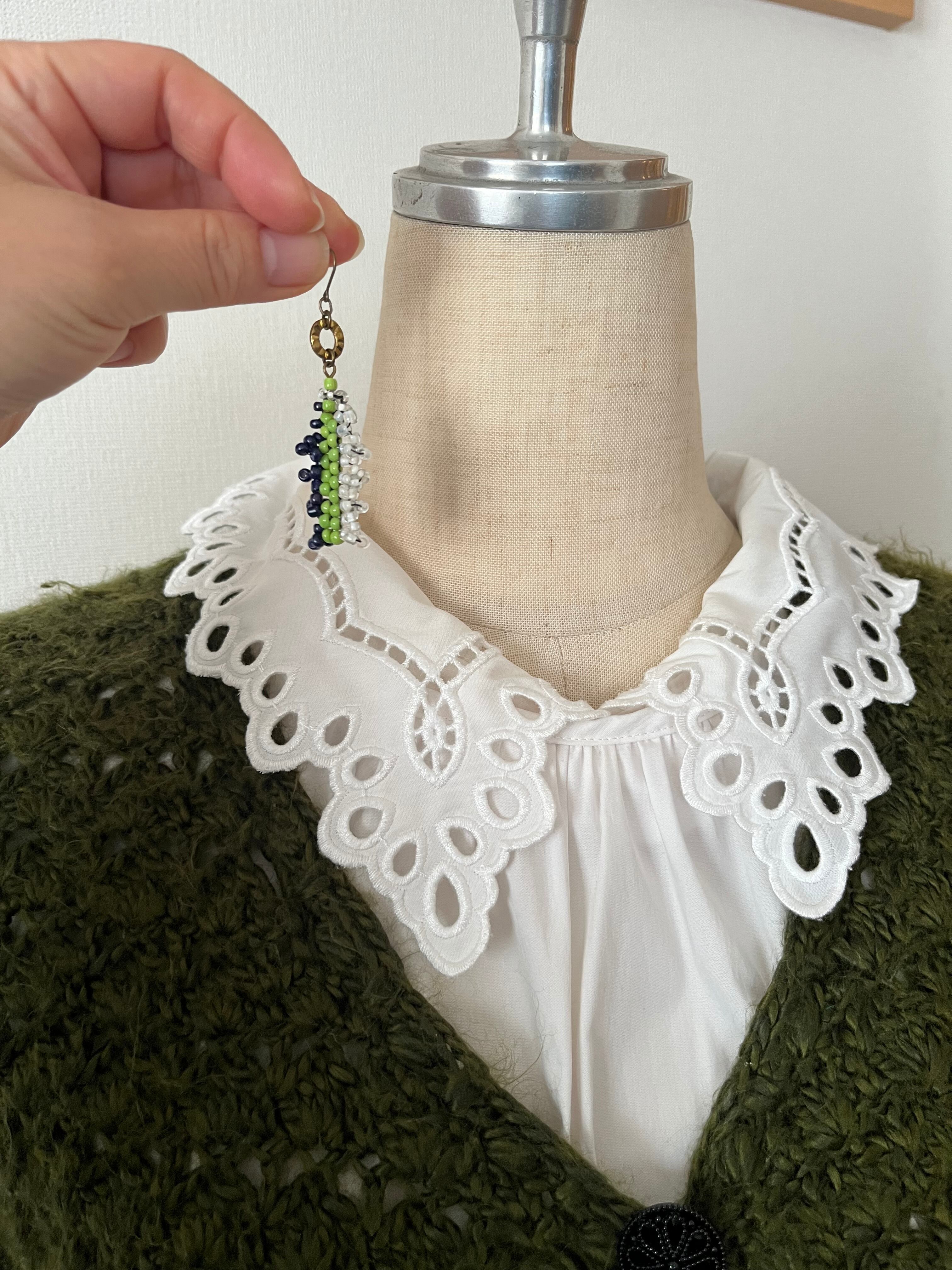 不揃いの3色のビーズが編み込まれた、ユニークなモチーフがメインのピアス(イヤリング)です