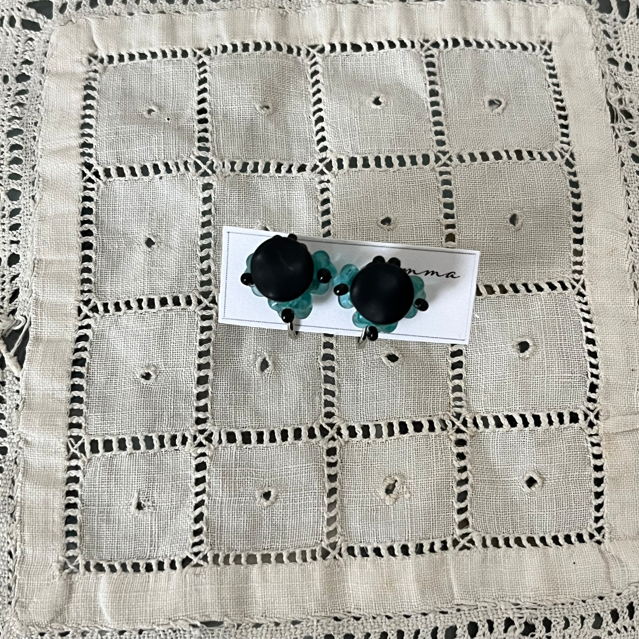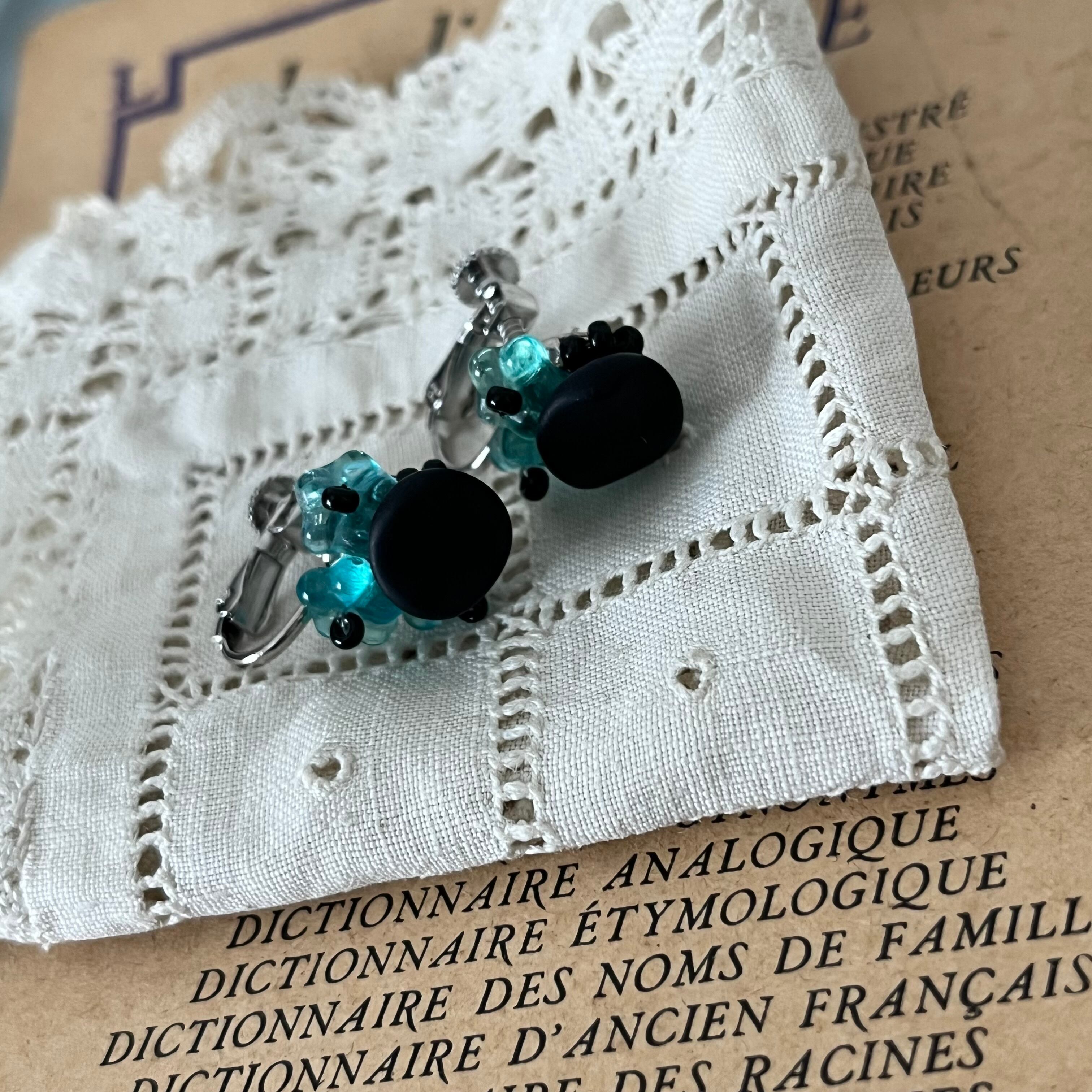 マットブラックのヴィンテージボタンの周りに、ブルーフラワーが飾られたイヤリングです