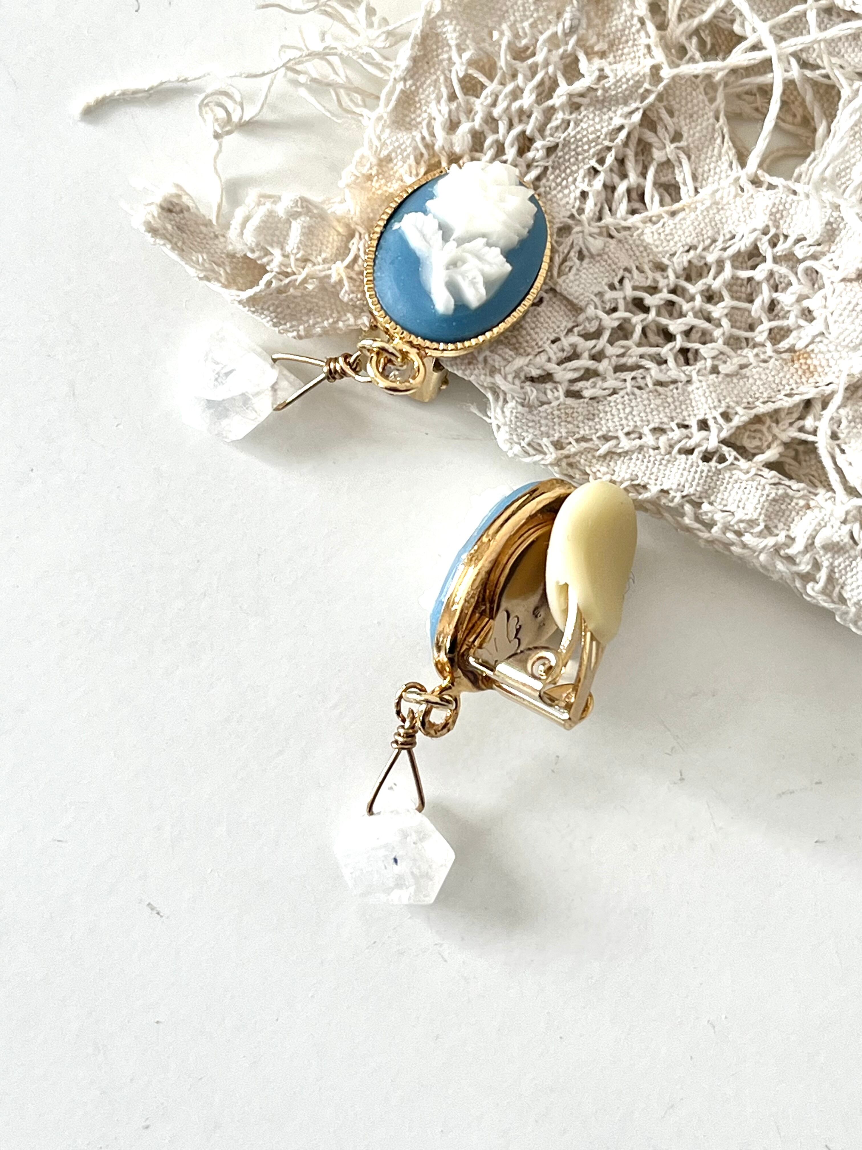上品でありながら、華やかさも兼ね備えた、花と月 イヤリングです。ペンタゴン型のムーンストーンが揺れ動き、耳元を優美に彩ります。