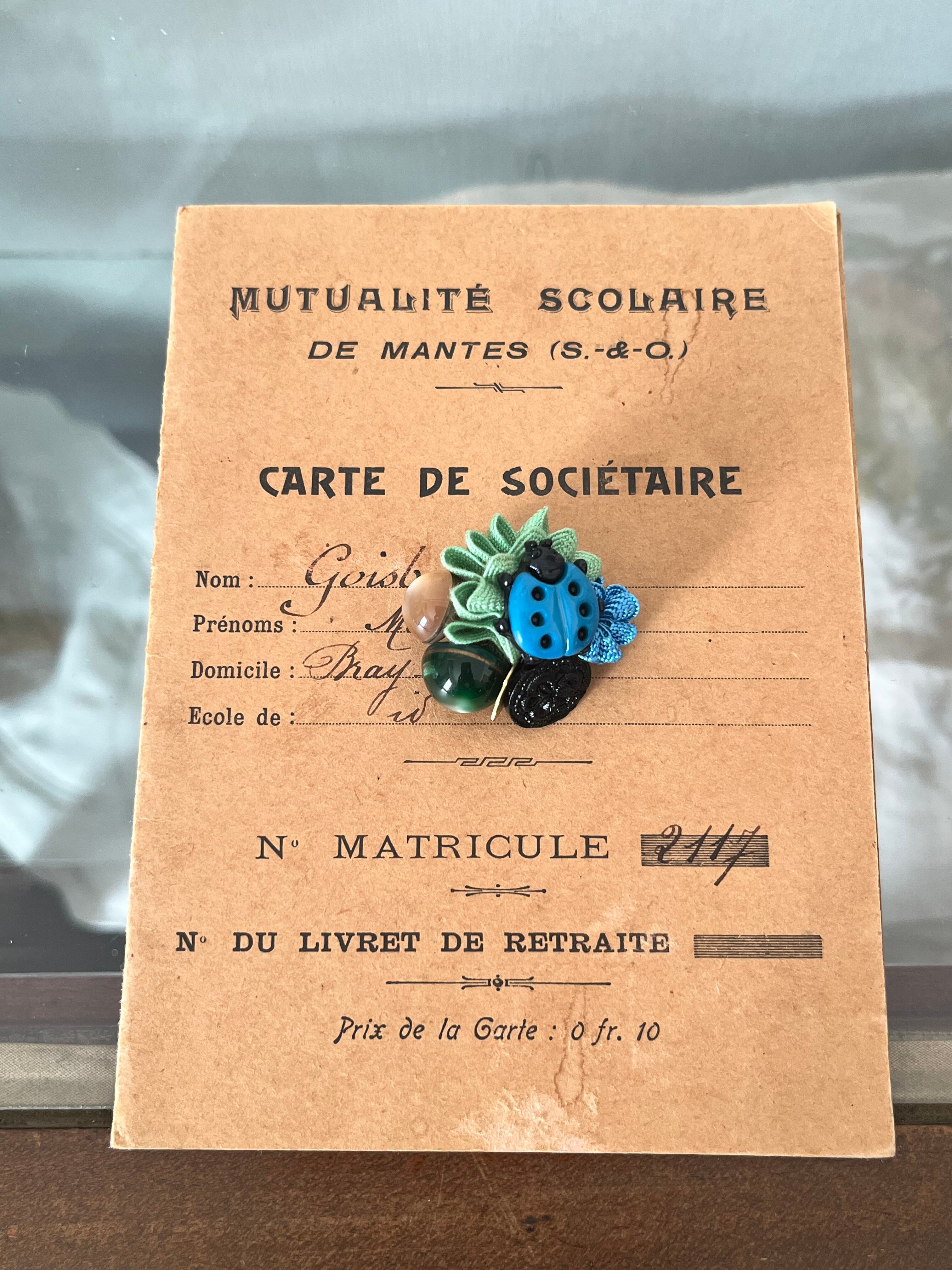このブローチは、鮮やかな青色のてんとう虫が笑顔を誘うデザインで、さり気なく存在感を放ちます。
