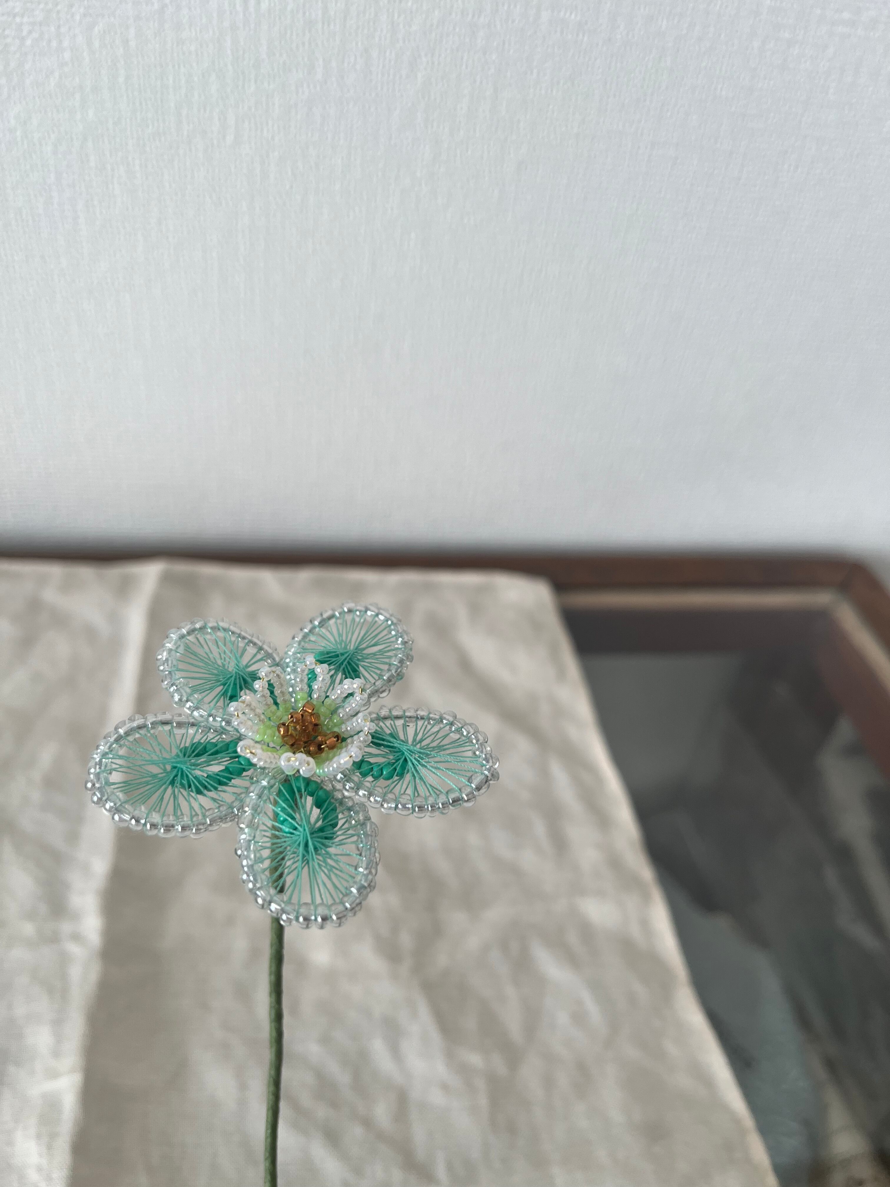 爽やかなグリーンが特徴のthread flower グリーンです。糸とビーズで丁寧に作られたこの花は、見る人に新鮮な印象を与え、インテリアに活気を加えます。